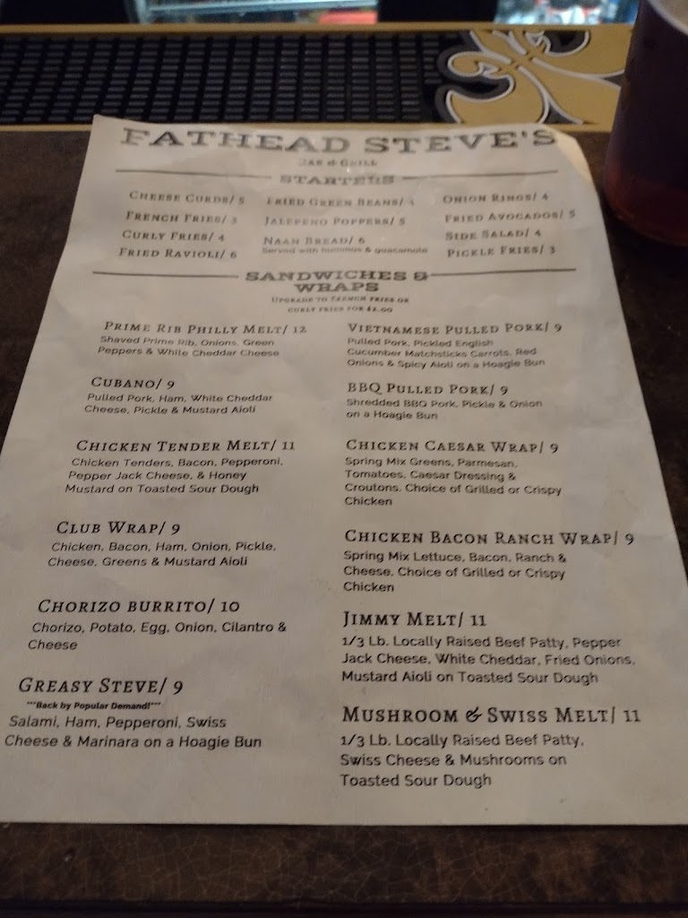 Relaxed and welcoming atmosphere with great service. If you are looking for a great little bar and grill for a solid lunchtime experience, then Fathead Steve's is the place. The cook absolutely knows what they are doing, my variation on the patty melt was cooked to perfection and the fries were as good as I've had. Will definitely be back!