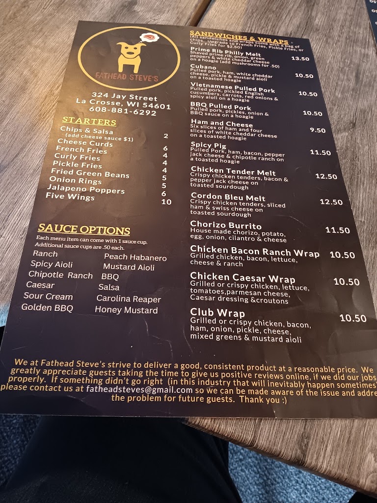As a person who has only eaten at the Fathead Steve's food truck, I was really looking forward to visiting the restaurant, and it did not disappoint! The Cubano sandwich was AMAZING. Our server told us to get the pickle fries, so we get addicted to them and come back. He definitely wasn't wrong! We will be back for more pickle fries. They were delicious! Also, they had one of the best bloodies we've had in the La Crosse area in a while. The service was great and quick for a Saturday afternoon. Highly recommend!