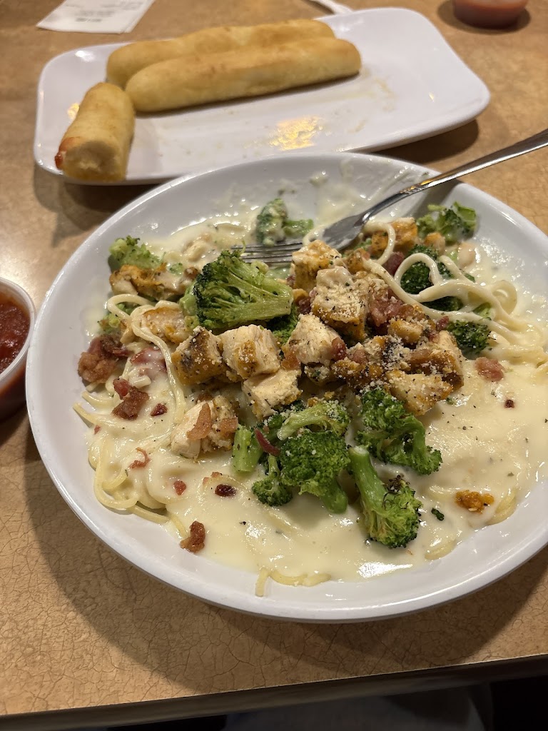 Food was nice and hot. Breadsticks fresh. Service friendly. Fettuccine nice and saucy