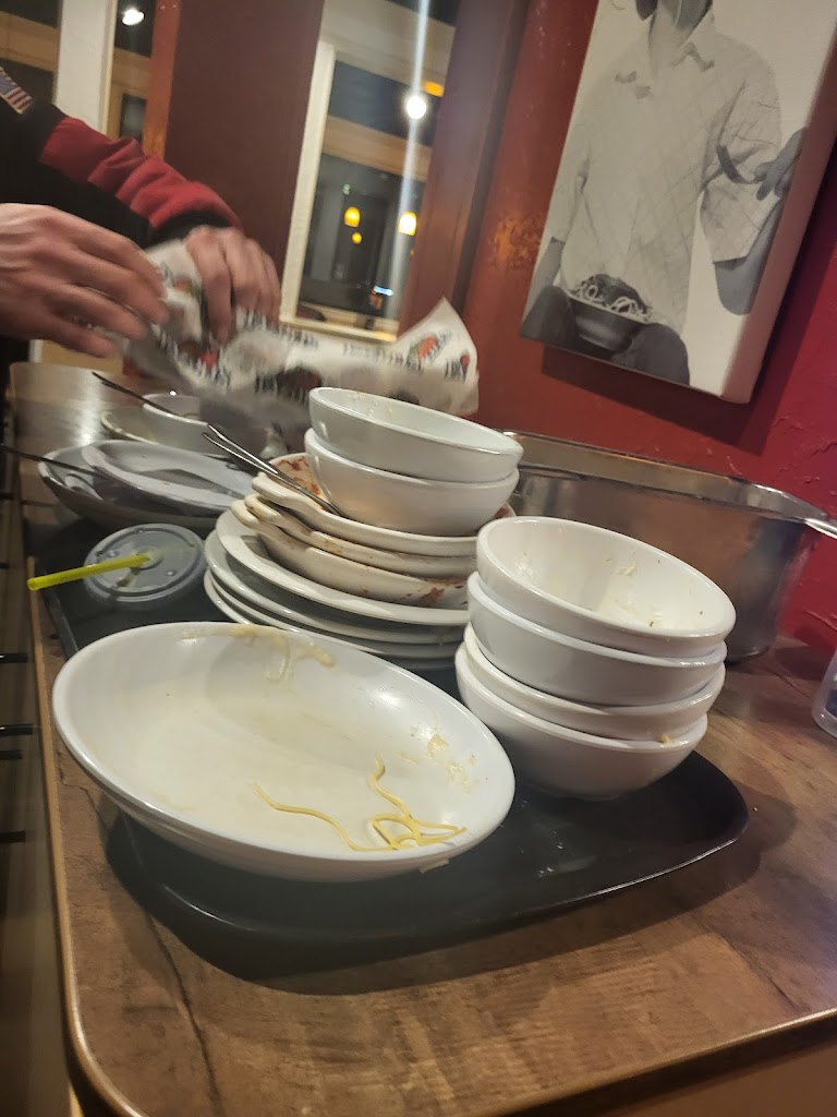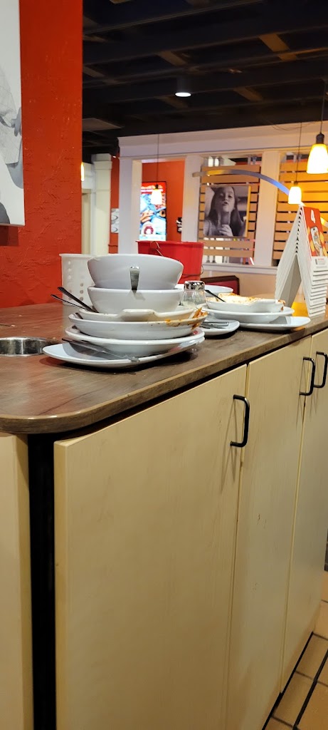 Absolutely filthy! Food and garbage on the floor throughout the place and large stacks of dishes not cleared away. Food was Luke warm even though only 4 other people were in the restaurant. It was 5pm on a Sat 12/7/24. We waited 15 minutes for our food. Nobody came by to ask if we wanted breadsticks. We absolutely will never go there again. ( the pictures only depict a glimpse of the fifth )