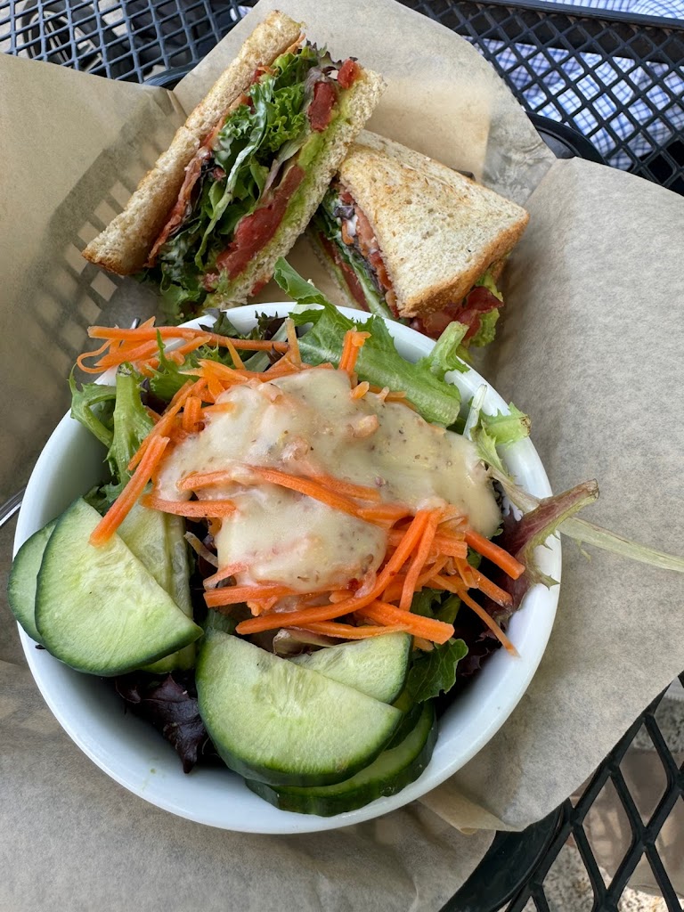 I stop here way too often. Expensive habbit that I can't seem to break. The staff is super friendly and always willing to get creative with your requests. I've been hear more than 30 times and never had a negative staff experience. Outdoor seating is amazing next to river or the enclosed fireplace area. I'm obsessed and need to go now. Love everything on the menu. Only thing I noticed is you get a way bigger side salad if you dine in. Take out is Itty bitty