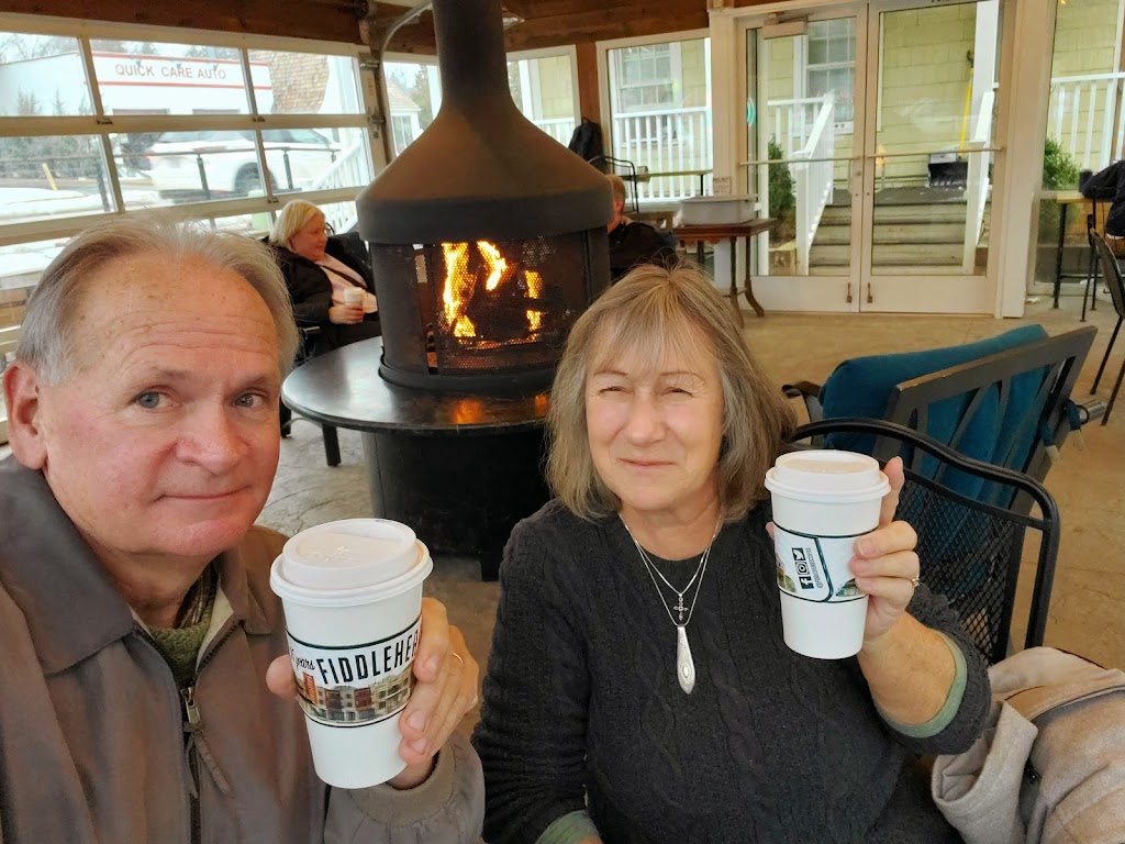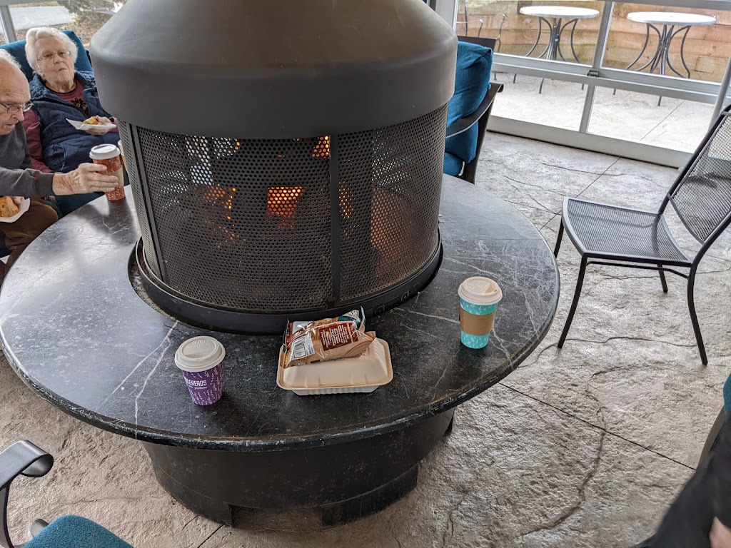 Sit outside in the gazebo, don't worry the gas fireplace keeps it plenty warm. Great coffee, and if your gluten free they have several bakery items for you. I like the gluten free coffee cake.