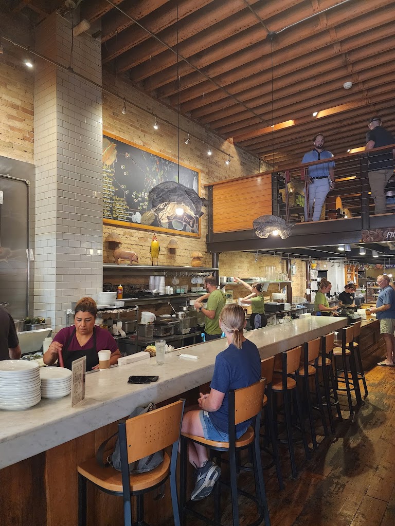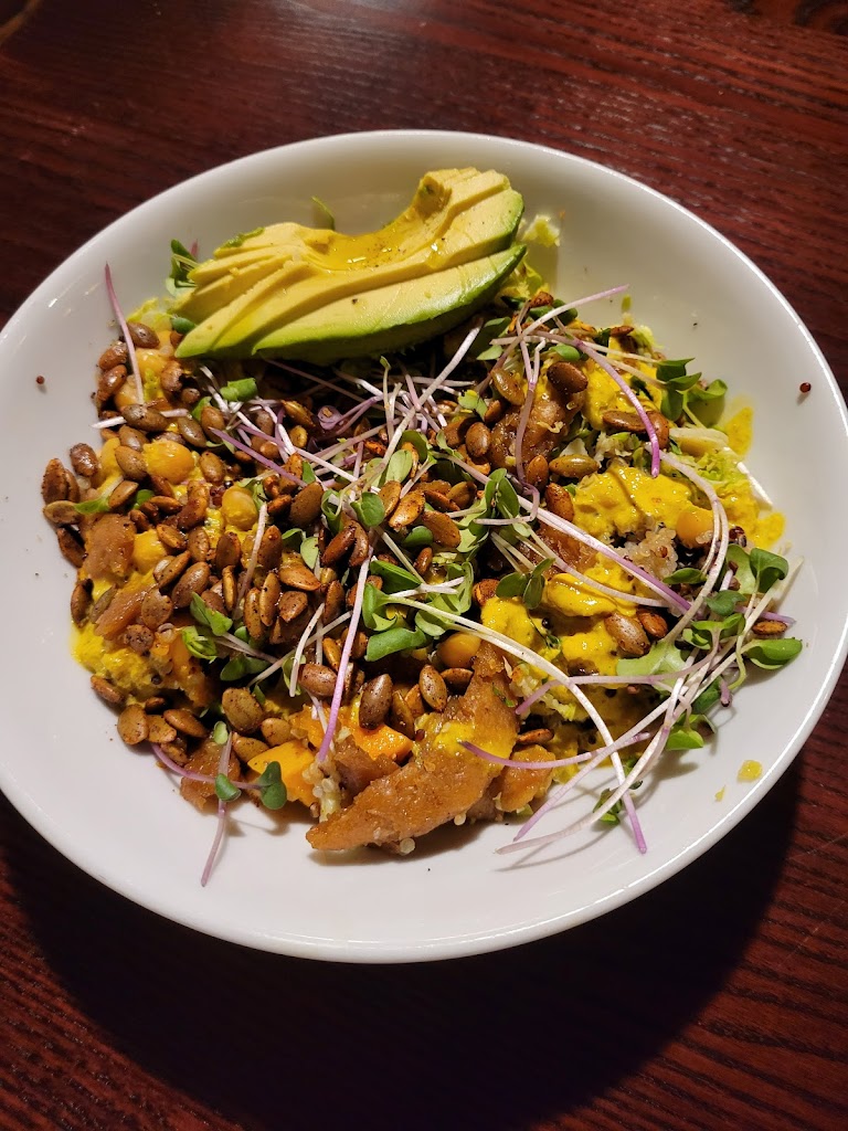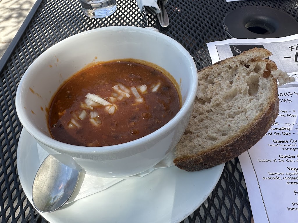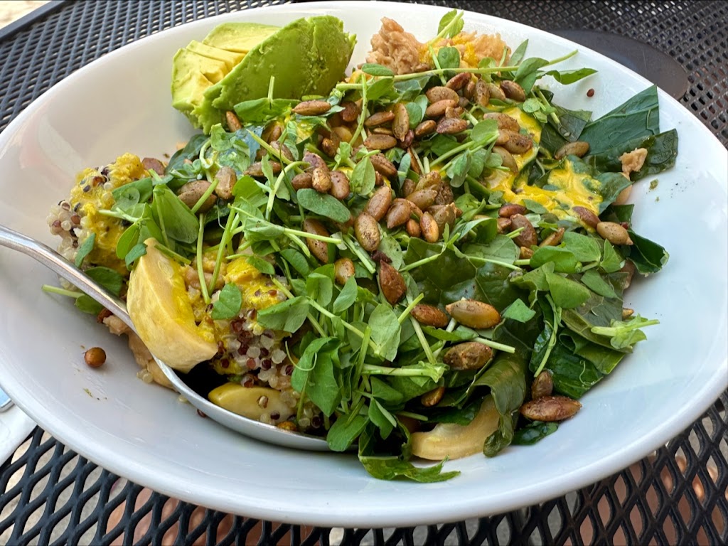 What a lovely dining experience! The ingredients are so fresh and flavorful. It was hard to pick from the menu- a good variety of salads, sandwiches and breakfast dishes. I went with a cup of chi (amazing) that came with a huge slice of fresh, soft wheat bread with a crunchy crust and the vegan bowl- so many delicious flavors including the coconut curry dressings, kale, summer squash and other goodies. My husband said it was one of the best burgers and freshest slice of tomato he’s had. Our sever Kim was super nice. Definitely a must stop for breakfast or lunch- outdoor patio is great with lots of spots and shade on 8th street!