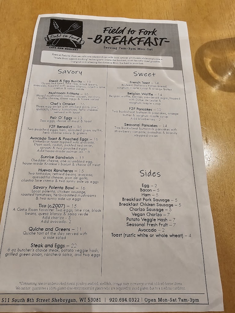 Field to fork is an awesome place for breakfast and lunch. They take a farm to table approach and have very fresh produce and meats. It is an old historic building which is decorated very nicely. They have great food options, and it is all very good.