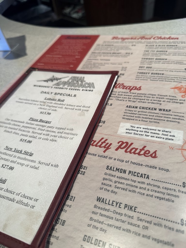 This is my first time back to the Final Approach in 15+ years… not sure why I stopped going except I thought it was more of a bar with basic pub food. But this is more of a full restaurant…. with a great selection of dishes, including my favorite restaurant meal… Meatloaf. I ordered the meatloaf and it was absolutely delicious. This is the first time I ever had meatloaf for the barbecue sauce and that was really really good. The service was great, our server was very attentive. You’ll be glad you checked this place out.
