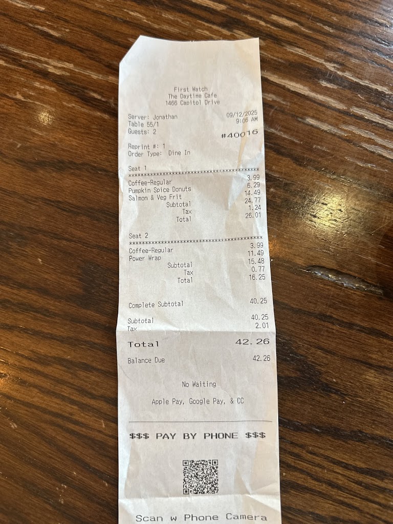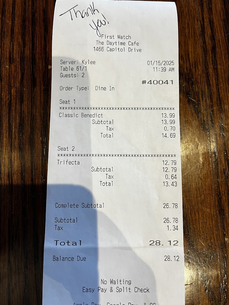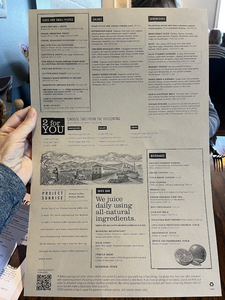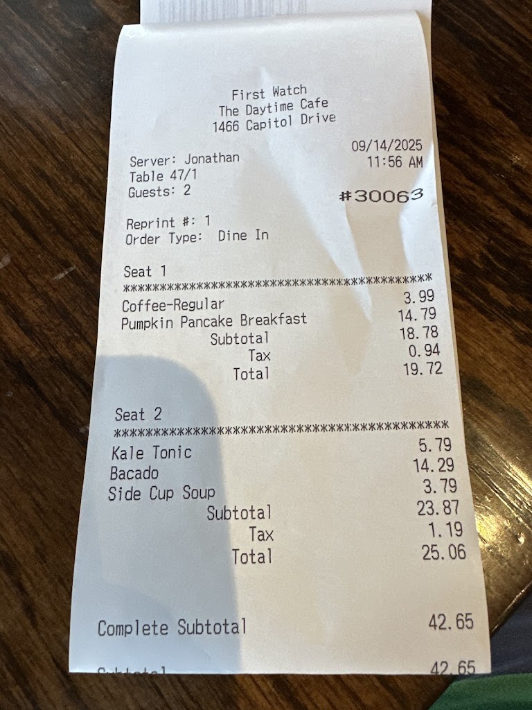Food was delicious as expected. Had the pecan salad and avocado toast. Our wait person was efficient and friendly. I have eaten at Greendale and Waukesha locations and the results are consistently good. Priced reasonably as well