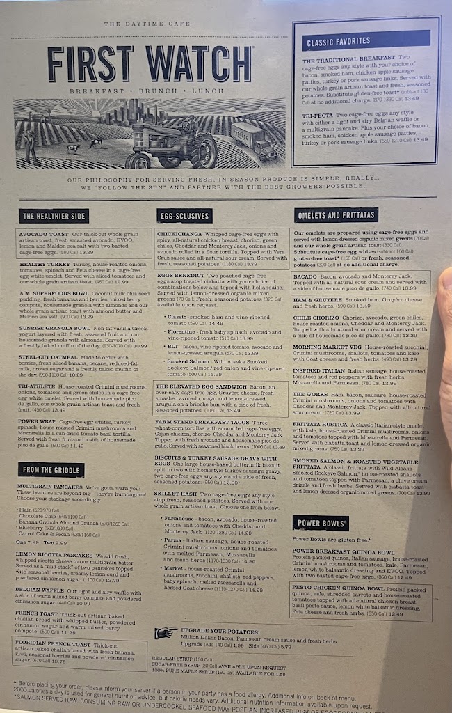 First Watch is an award-winning breakfast, brunch and lunch spot, serving a chef-driven menu of elevated classics and seasonal specialties, always made to order using the freshest ingredients. We greet the sunrise by slicing and juicing fresh fruits and vegetables, whipping French toast batter from scratch and brewing pots of our single-origin Project Sunrise coffee. Freshness is never comprised, which is why we welcome each season into our menu with ingredients and flavors inspired by the position of the sun. All year long, you can enjoy craveable favorites like Avocado Toast for breakfast, Smoked Salmon Eggs Benedict for brunch and Lemon Ricotta Pancakes for lunch. Whether you start at the crack of dawn or not, we'll leave that up to you!