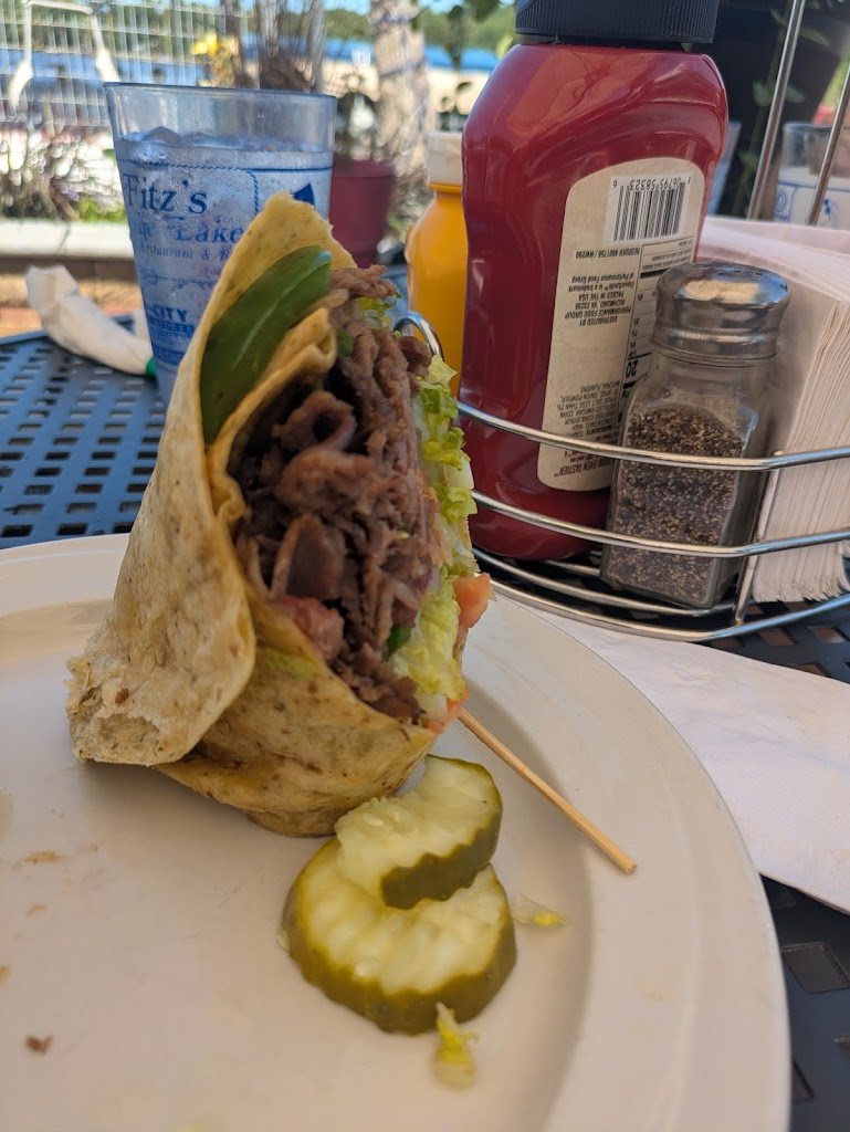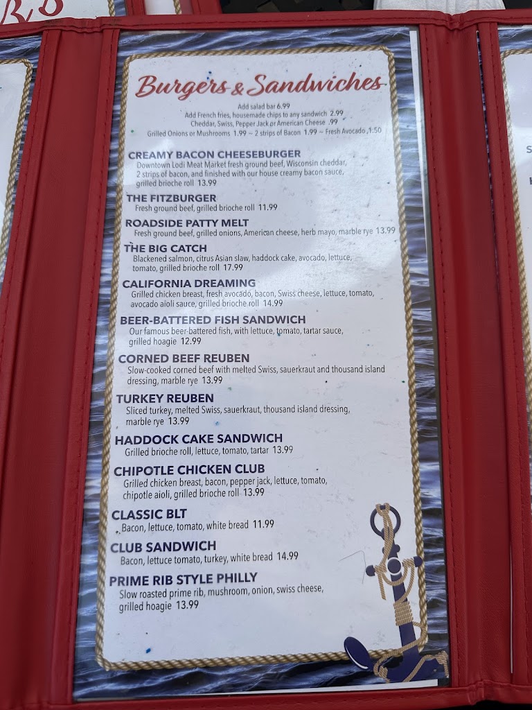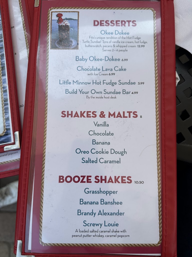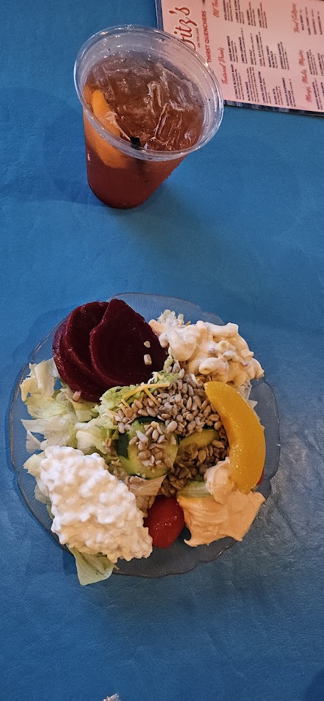 We were nearby for the Susie the Duck festivities and Fitz's was recommended. My wife had the 16oz prime rib which was good, not the best, not the worst. I had a haddock cake sandwich which was also ok, much different texture than your standard fish sandwich which was also on the menu. There was an extra charge for most sides, even potato chips with sandwiches. I felt it was expensive for what we had given the quality. The normally open eating area was enclosed due to rain, which is understandable, but there was nearly only picnic table seating, no seat backs so we ate inside. The service was great and there was a singer with guitar for entertainment.
