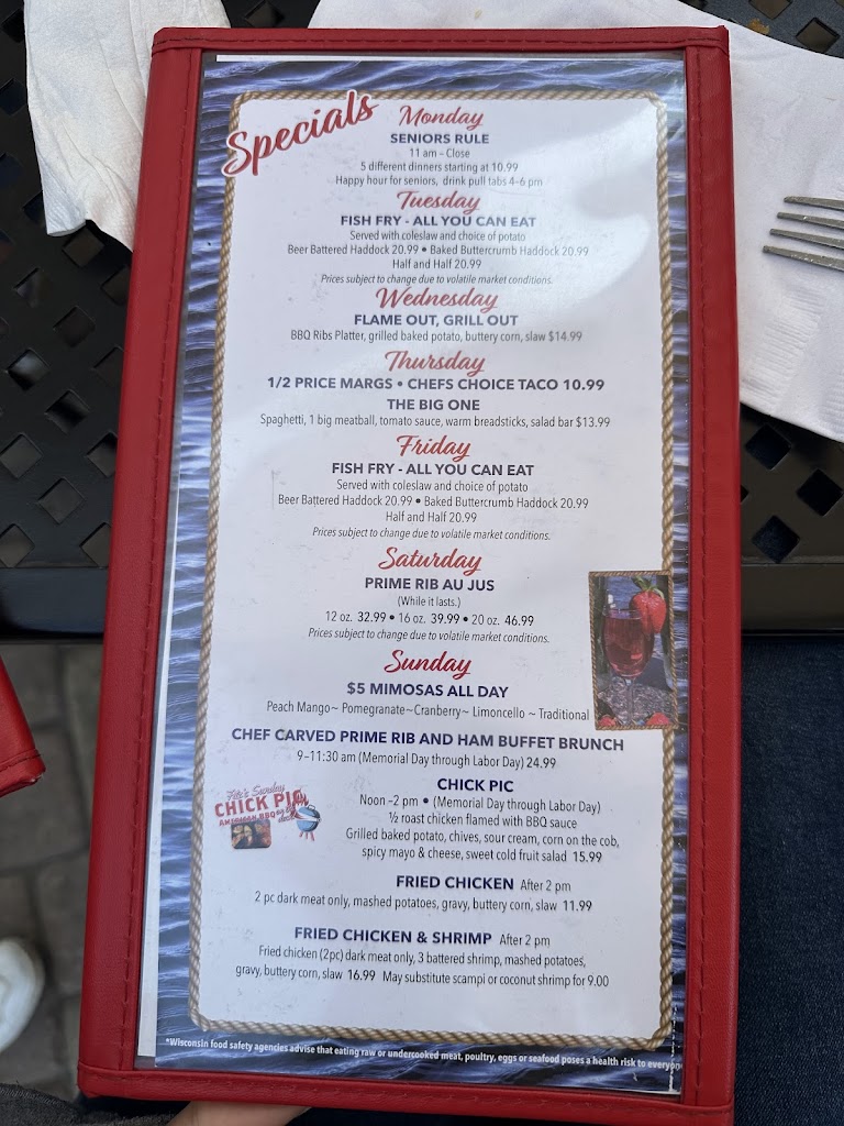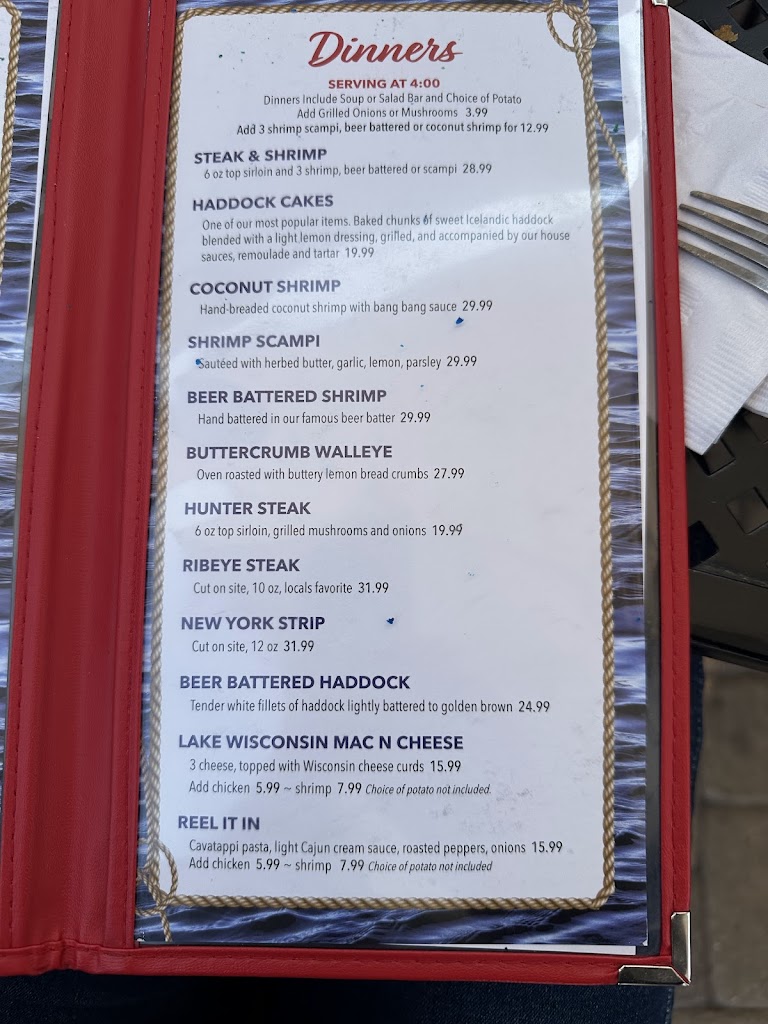 Great Friday fish fry that is all you can eat haddock. Wonderful location & fun staff. A little pricey but it’s Lake Wisconsin so factor that in.