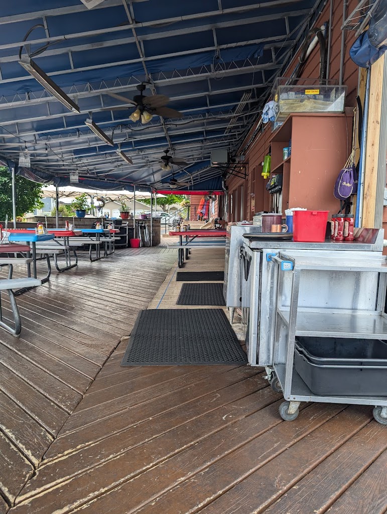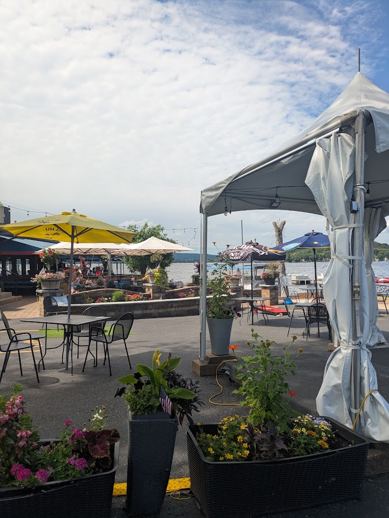Saturday, Aug 10, we were looking for spot on the lake for late lunch and drinks There were two of us. There were at least 6 -8 open picnic tables available where we could have seen the lake. But instead we were led to the two tables for two, behind the tarp/wall. I expressed our desire to sit at a picnic table where we could see the lake. NOPE, the hostess insisted that was all she had available. There was not a line waiting to get in; wasn't that busy. She was Not Accomodating at all! I suggest you go elsewhere...where there us music and a view if the lake.