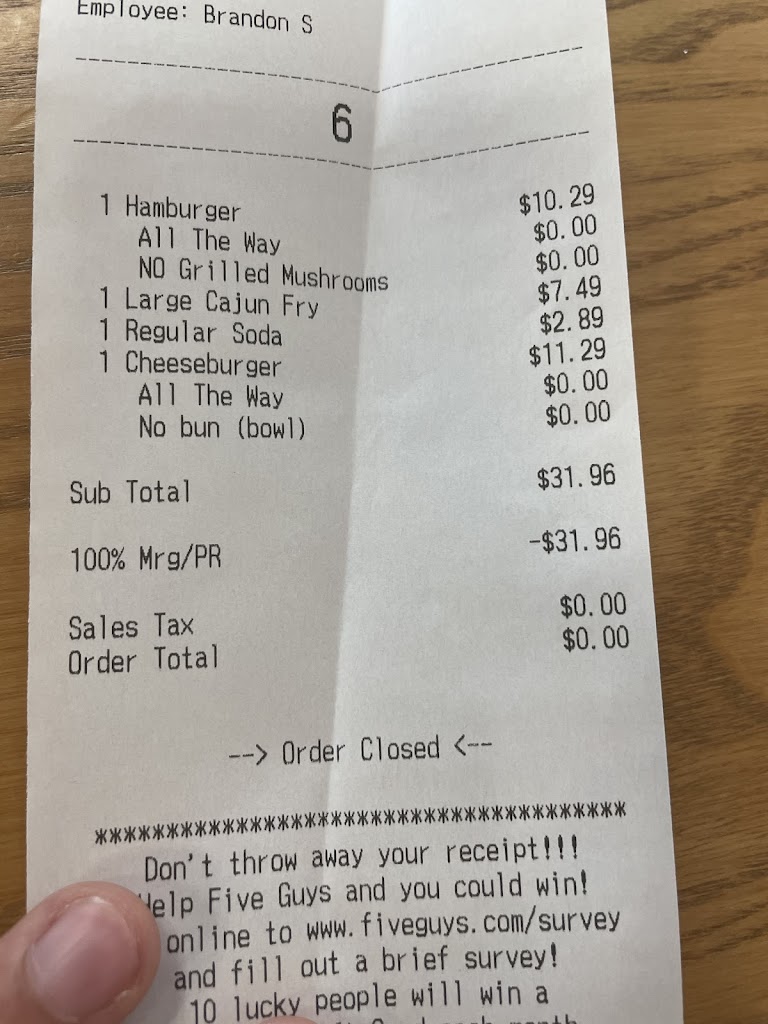 Around $15.50 (+ requested tip) for a little fast food burger and little fry (no drink). I hadn't had it in a while so I thought I'd give it a try. The fries are still top rate. The burger quality seems down or maybe my memory propped it up as being better than that actually were. The meat was gritty. The workers were friendly enough but unless I get rich enough that I can spend copious amounts of money without batting an eyelash, I'm probably done with Five Guys.