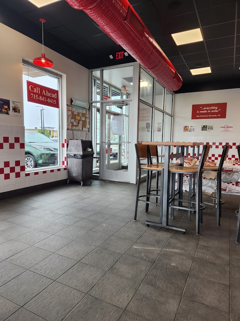Your nearby Five Guys at 226425 Rib Mountain Drive in Wausau is ready to offer you a classic take on burgers, hot dogs, fries, milkshakes and more! Whether it's using fresh ground beef (there are no freezers in our restaurants), double-cooking our fries in 100 percent peanut oil, hand-preparing fresh ingredients every morning or serving peanuts while you wait, we strive to provide the best experience each and every time you visit. With more than 250,000 ways to customize your burger and 1,000+ milkshake combinations, satisfying your craving is just a click away!