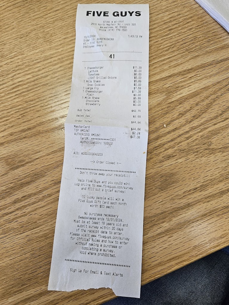 Food was good, service was excellent 👌. The ladies working were all clean and polite. When I peeked in the cooking area it was also clean. People like myself pay attention to these things. I attended the five guys in Mayfair Mall in Wauwatosa, Wisconsin.