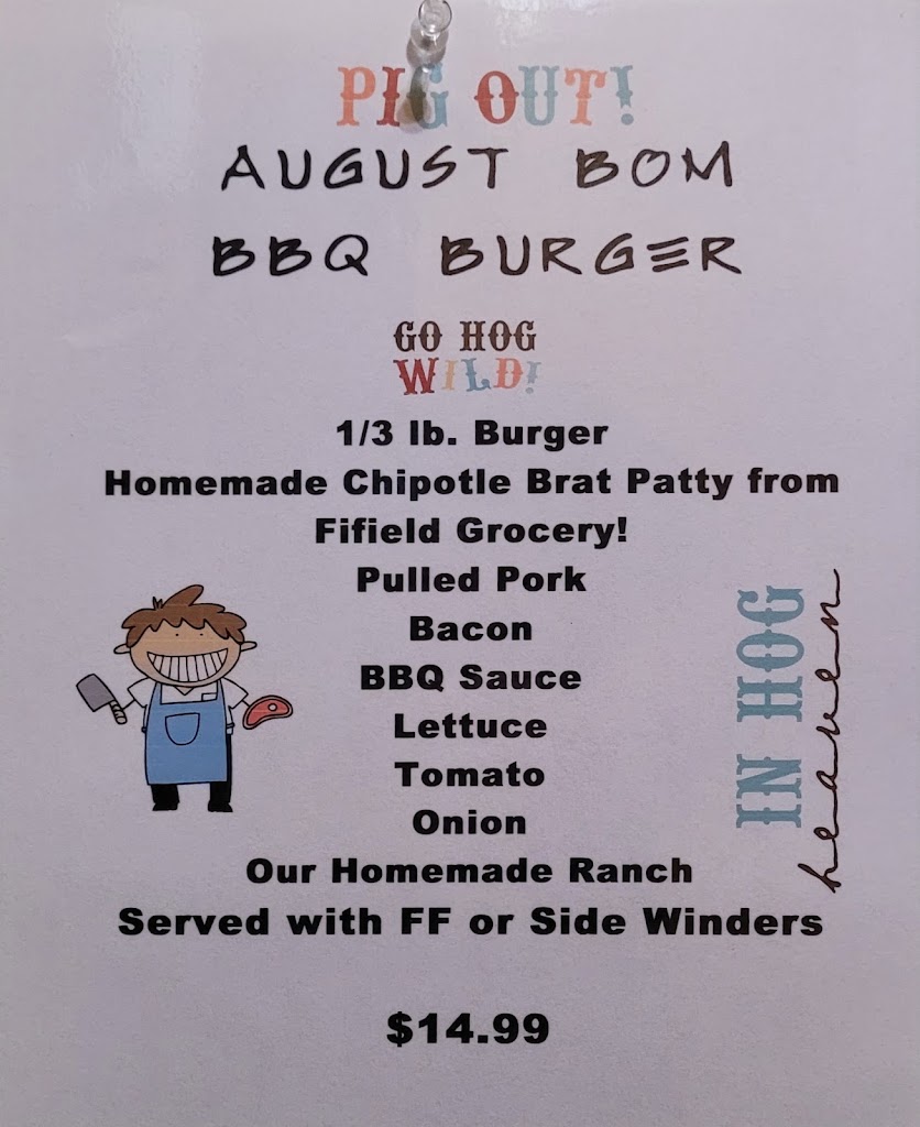 We chose the burger of the month. Beef burger, brat burger, kraut, cheese curds, it was delicious. We also had chicken and ribs. Delicious! And we'll have leftovers . Good people good food and cold beer.