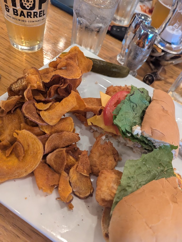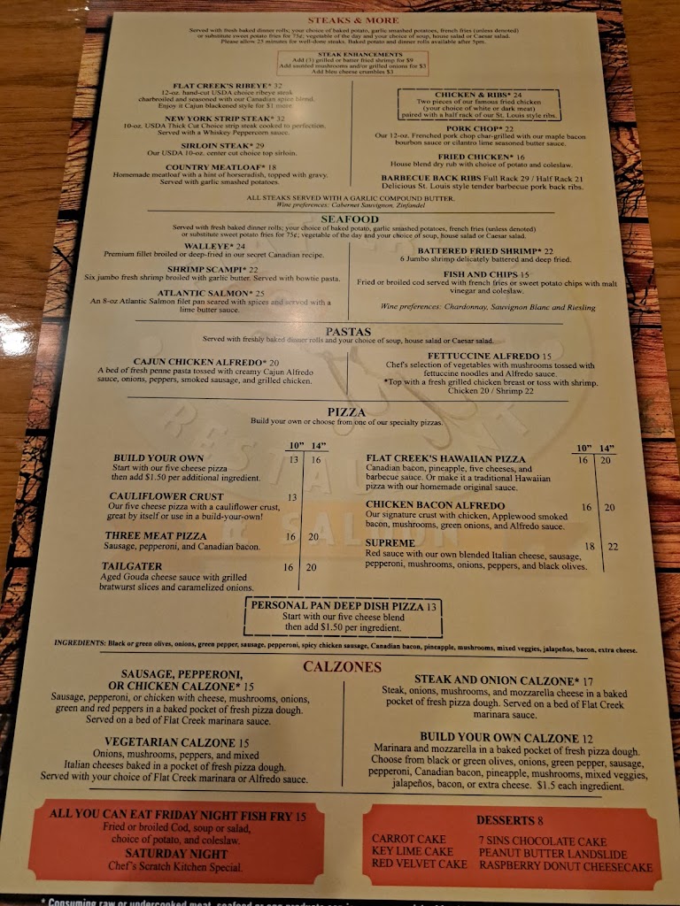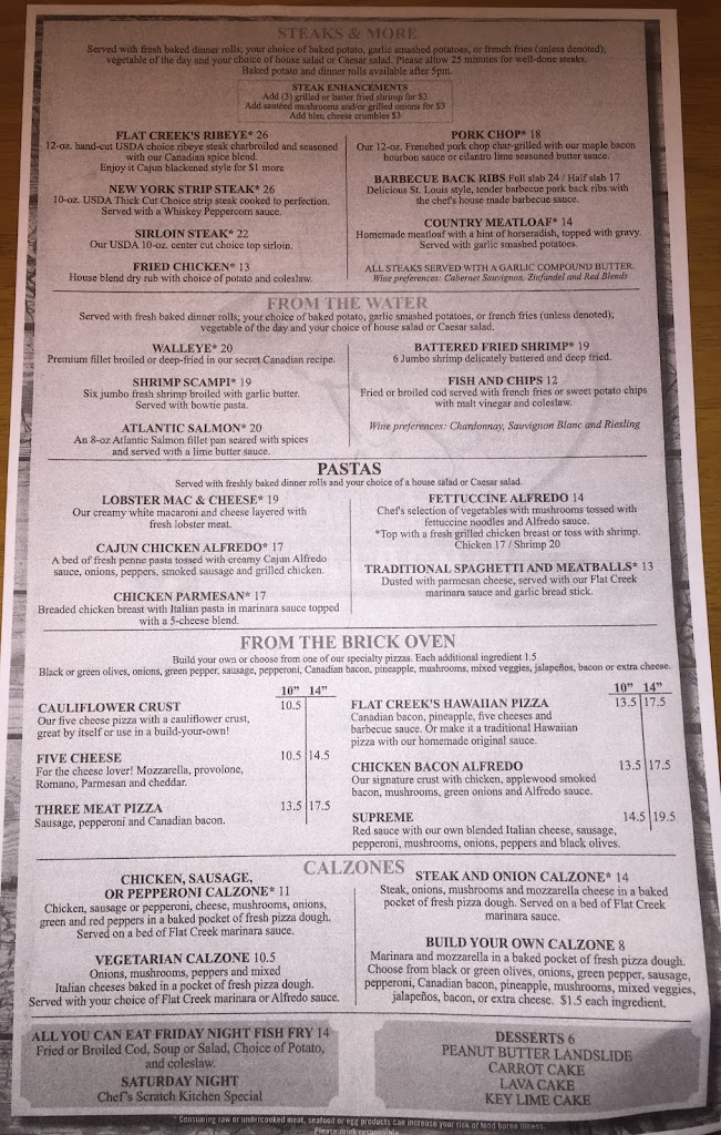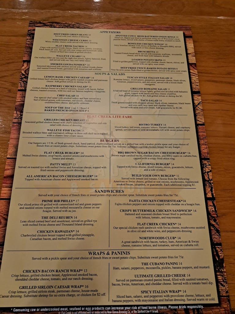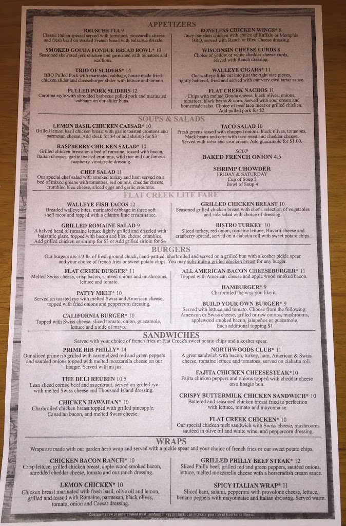Food wise there are a few of each, see pic of menu. I had the flat creek chicken sandwich. It was good but not great. See pics.