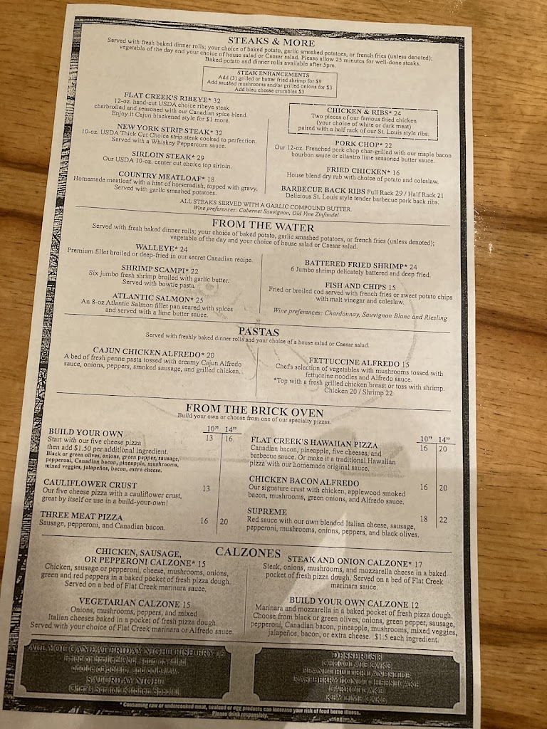 We had a great dinner at this restaurant while staying at the Flat Creek Lodge. The Walleye fish tacos were on the lighter side menu but the fish pieces were very large. I usually do not like coleslaw but there was just enough under each piece of fish to give it extra flavor and a bit of crunch. My traveling partner had the spaghetti and meatballs and enjoyed that very much. The prices are reasonable for a resort town.