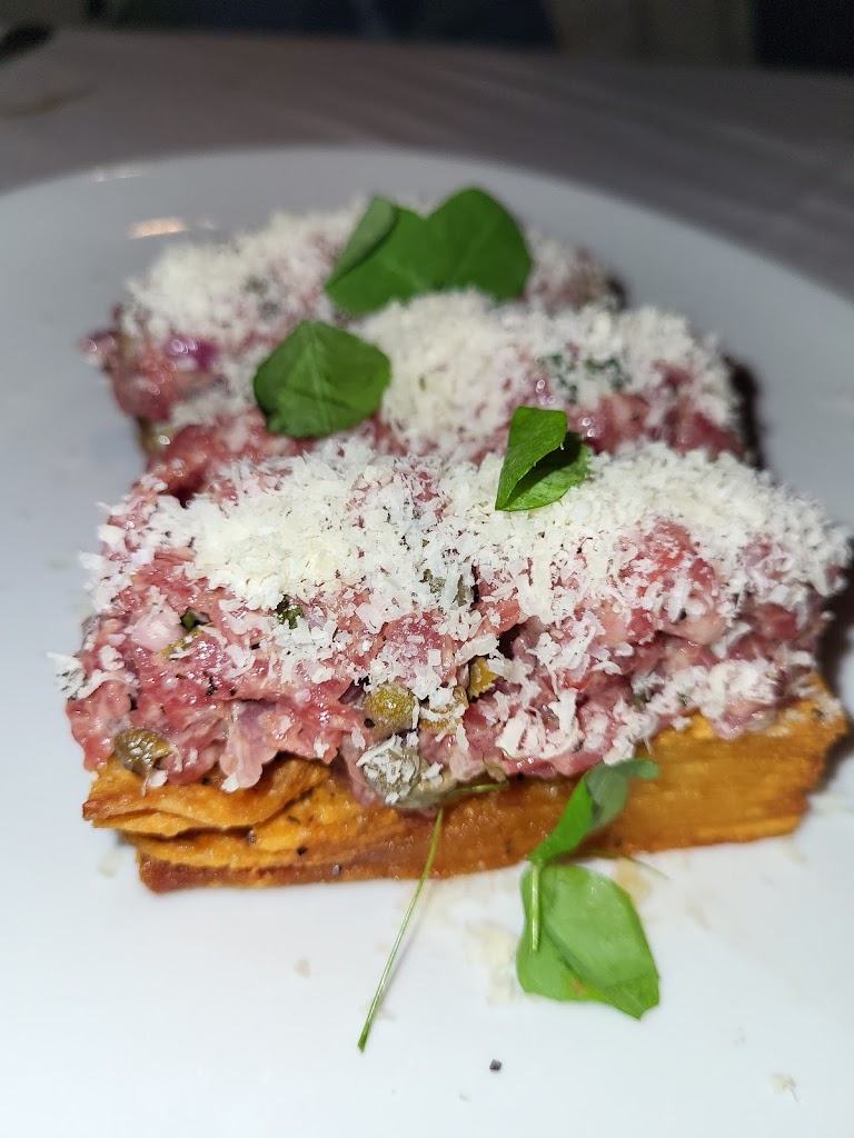 The beef carpaccio was probably my least favorite of any one I have ever had. Overly sauced. The bread it was served with was soggy as it was covered in cheese and then baked or broiled I'm guessing. It stuck together on the plate and was soft. It didn't give that nice crunch that I like with my carpaccio. The shredded egg was a nice touch. But overall not enjoyable.