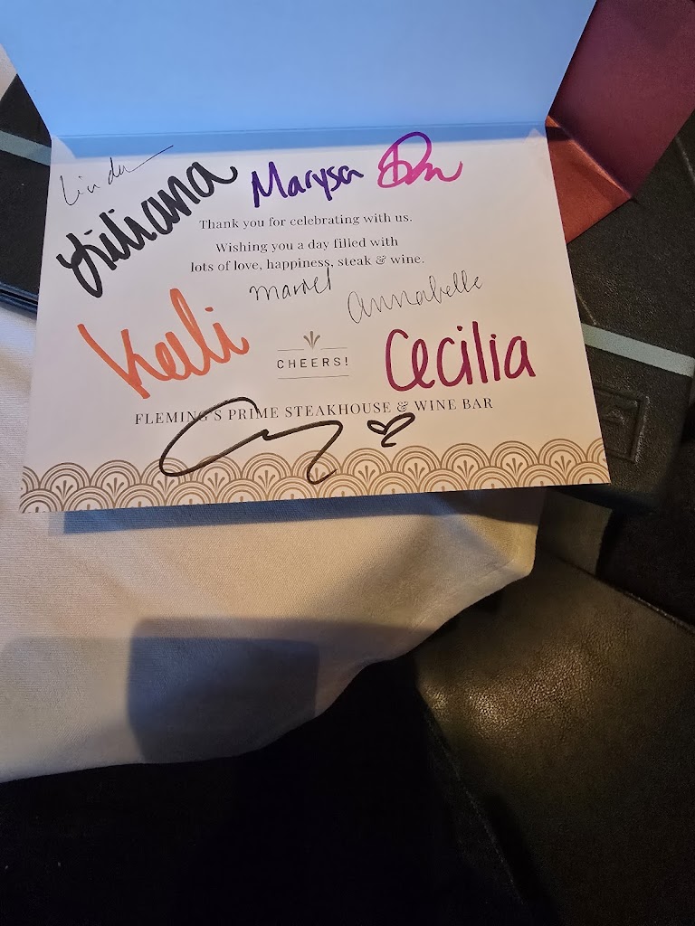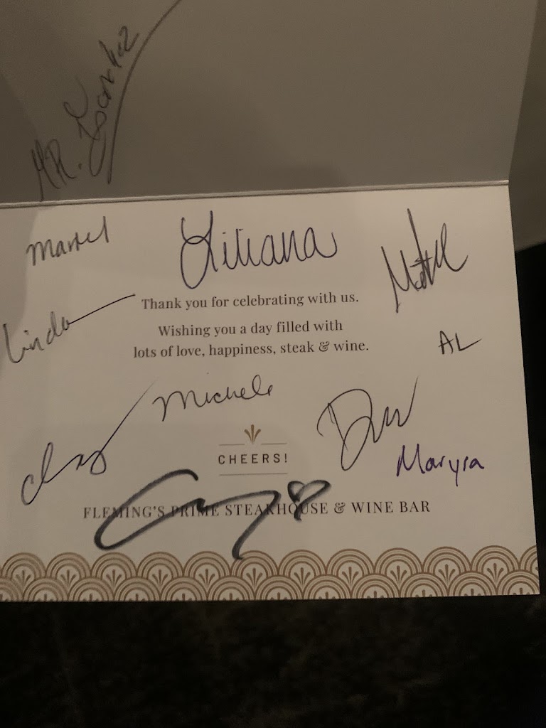 My wife and I always love coming here! The staff are always nice, courteous, and informative when explaining the menu. We always come here for our anniversary and they've always treated us special. Food is always amazing. Our waitress Gabi was awesome! We've had her twice now. Their attention to detail is always on point. The guy that brought our food cut out the lobster for us and noticed one of them wasn't cooked enough. He quickly took it away and brought another. We had our photo taken and a card was given to us with signatures from all of the staff. I ALWAYS recommend Flemings to friends and family. You can't go wrong!