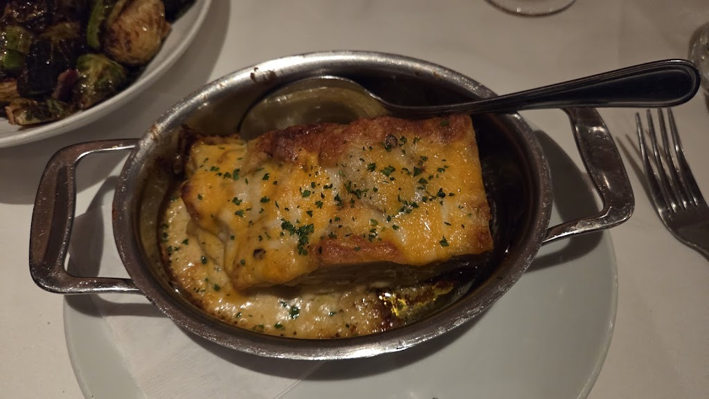 Visited very late Sunday afternoon for a family celebration with mixed opinions. Calamari ordered as an appetizer for all was not very warm, with semi-stale coating and tough-ish calamari. The petite filet arrived well-prepared (medium-rare), but was dry and mostly flavorless - a huge disappointment for such an expensive piece of meat. Scallops were well-prepared and very tasty as were the house bread and wedge salad. Brussel Sprout appetizer was only so-so - also a bit dry and not tender. Service was good and staff was friendly and efficient, but tended to hover annoyingly nearby. Wine list had a large selection. Would have preferred a locally owned option with lower prices and more consistent food. Overall a poor value but not unpleasant.