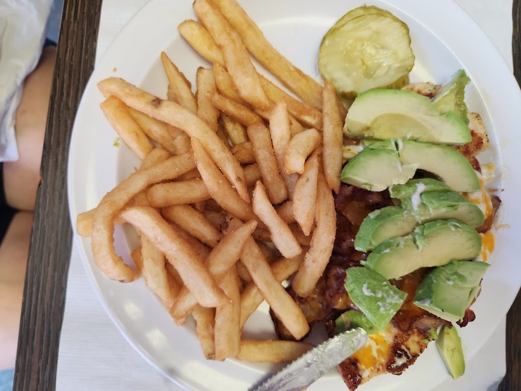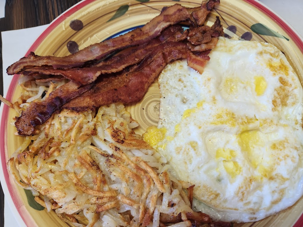 At noon on a Friday, we could still order breakfast, a burger, or a fish dinner....and they have a SALAD BAR! We will be back. The fish was good, nice & crispy.