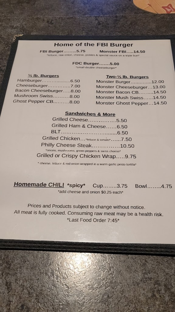 The FBI burger is Very Tasty! My fries were perfect (golden, crunchy, hot, seasoned perfectly), the cheese curds are excellent (white curd, no heavy breading, no oozing cheese from being over-cooked). Prices can't be beat! Really great food for an off- the-beaten-path bar! You need to make a detour if you're in the area :)