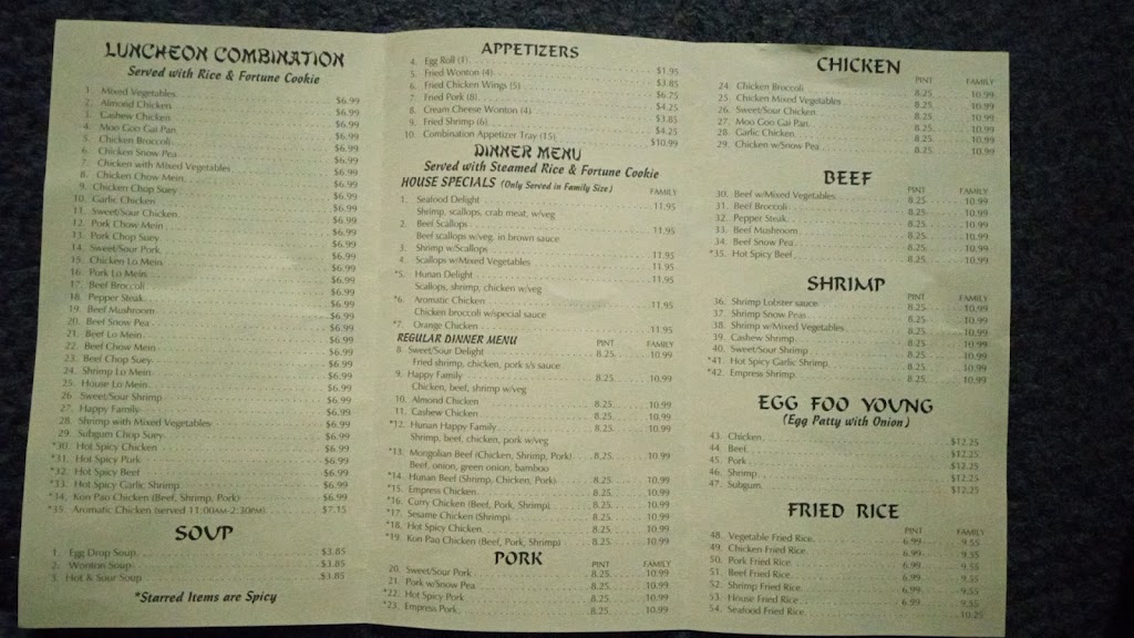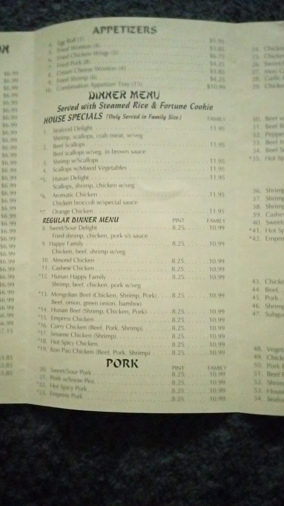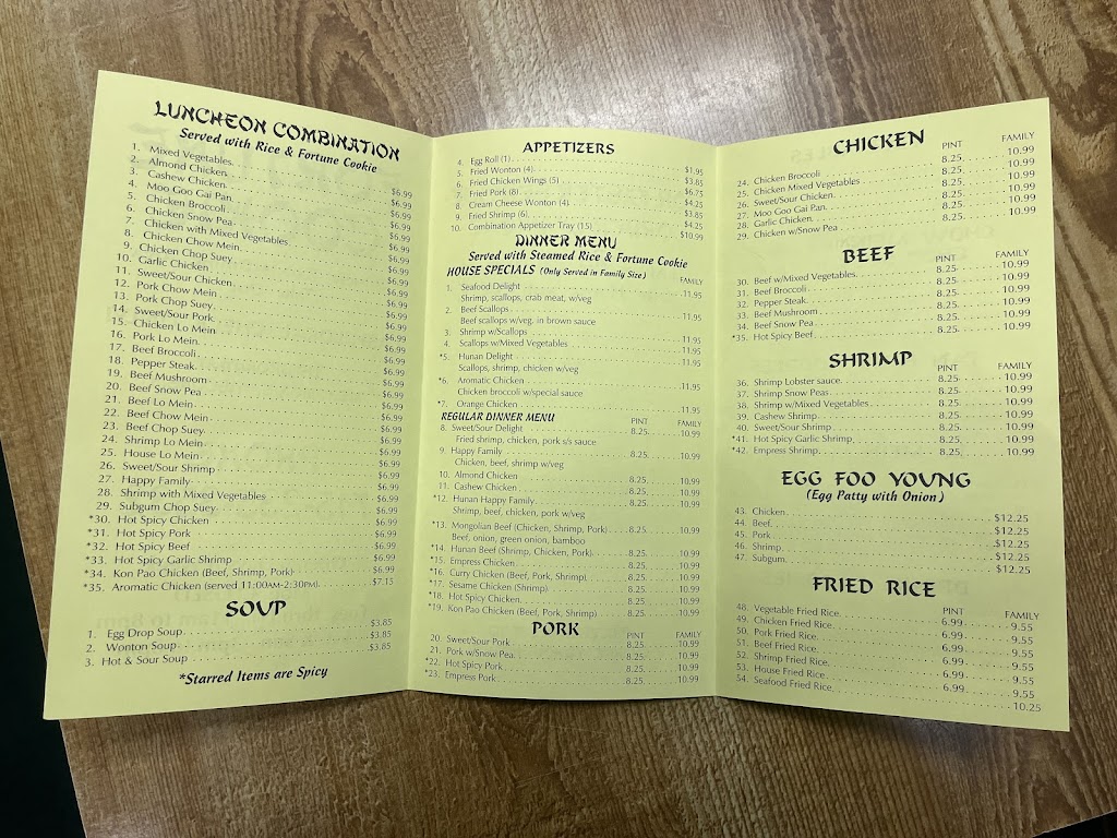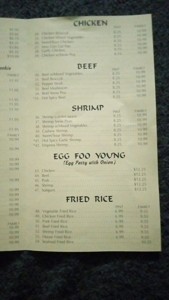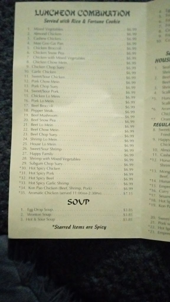 I have been eating here for over thirty years. I've tried every chicken, and most of the beef and pork dishes, but none of seafood. No seafood due to my allergies. Favorites : hunan beef, Kong pow chicken, aromatic chicken, and aromatic chicken. Always delicious, generous portions. Clean friendly service. Eat here most weeks and frequently more once a week! Egg roll!