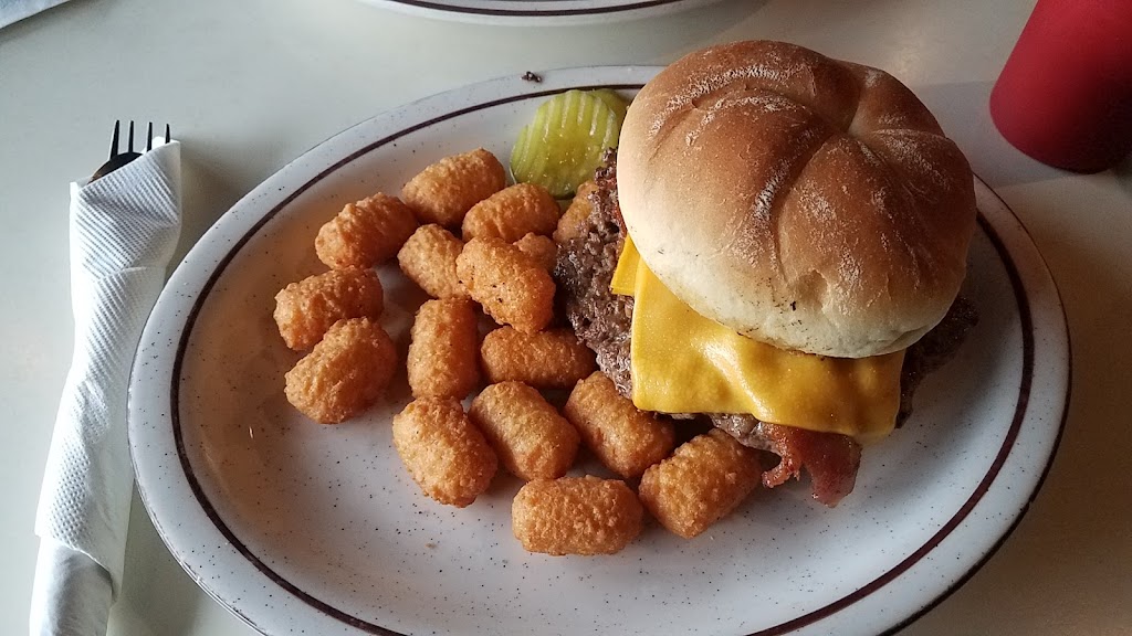 Had breakfast country fried steak and eggs was good. Pizza burger and fries and that was pretty good too. Would stop there again. Looks pretty ruff on the outside and inside . It wasnβt busy and the prices werenβt bad.