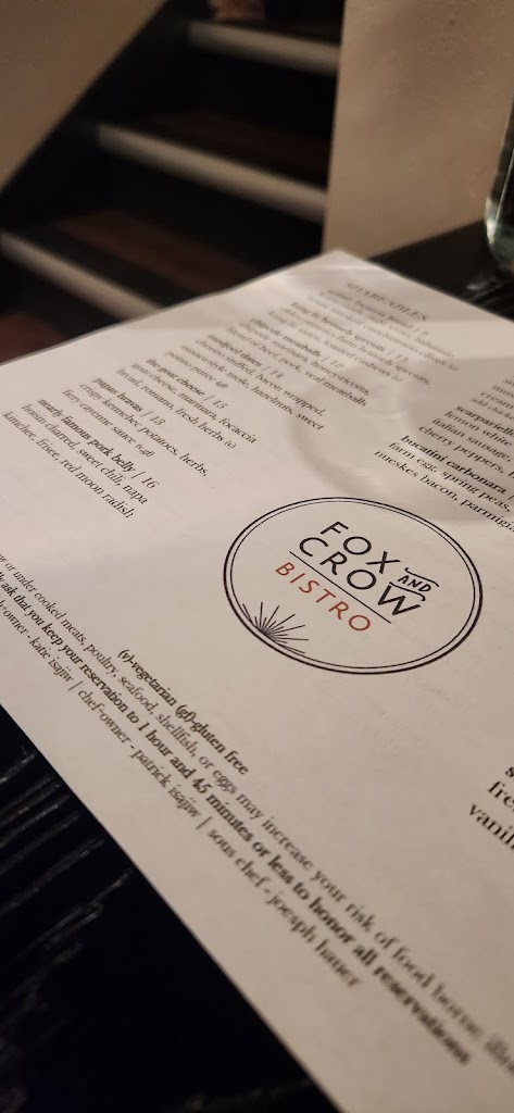 Had an outstanding dinner last night at Fox and Crow! We enjoyed a number of small plates as appetizers and they were all delicious--highly recommend the pork belly which was simply fantastic. In fact, I don't think you could go wrong with anything on the menu. We all loved our entrees! On top of that, it's a wonderful atmosphere. We'll be back!