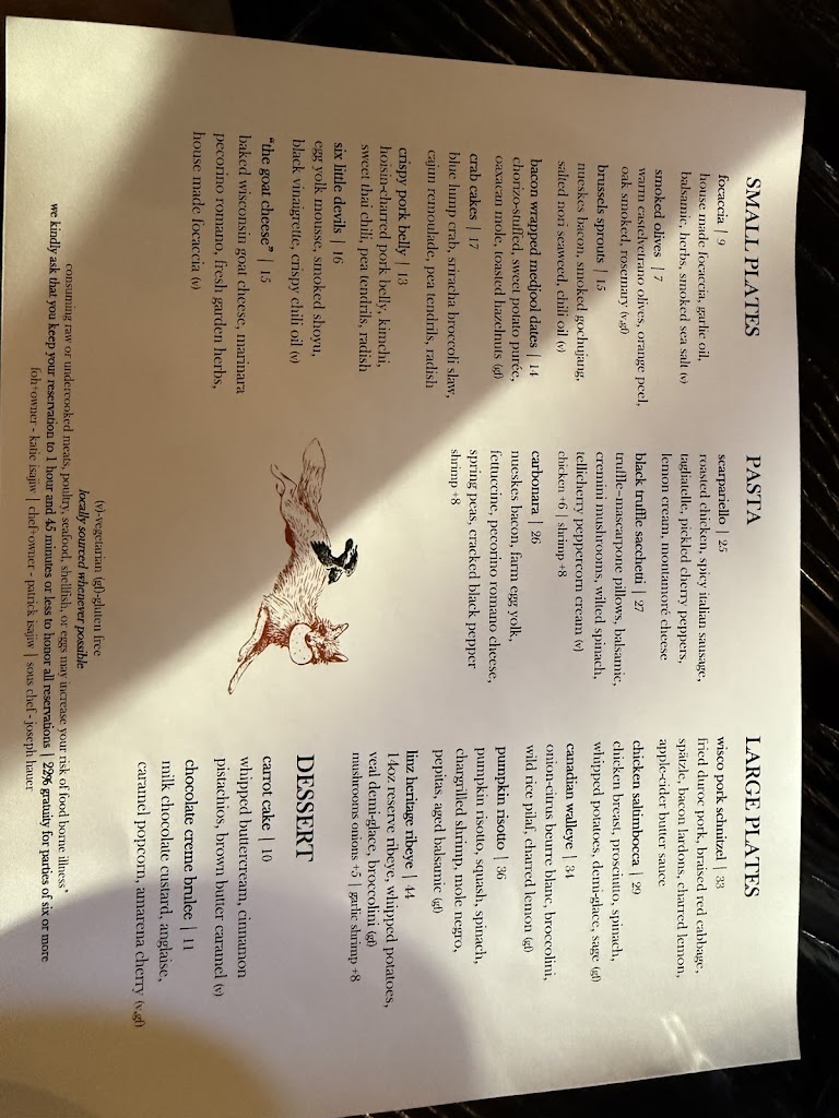 Just go here! Great foodie destination in central Wisconsin. The sweet potato curry soup was incredible and the truffle/cream/mushroom pasta shouldn’t be missed. The pork belly with kimchi was very yummy and the deviled eggs were good but not our favorite. We’ll be back!