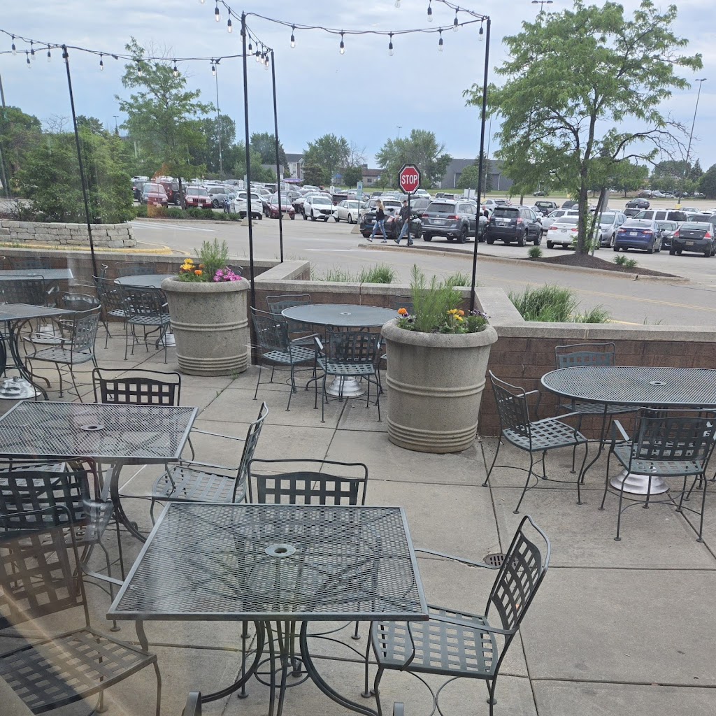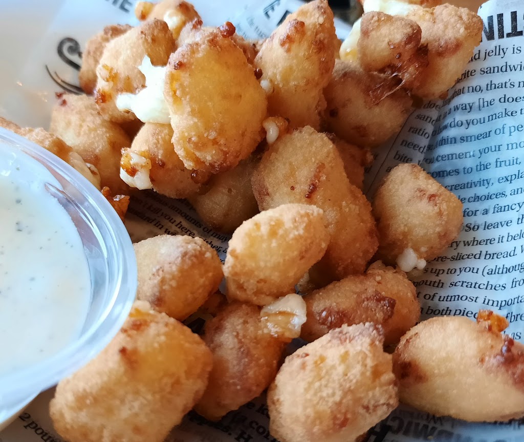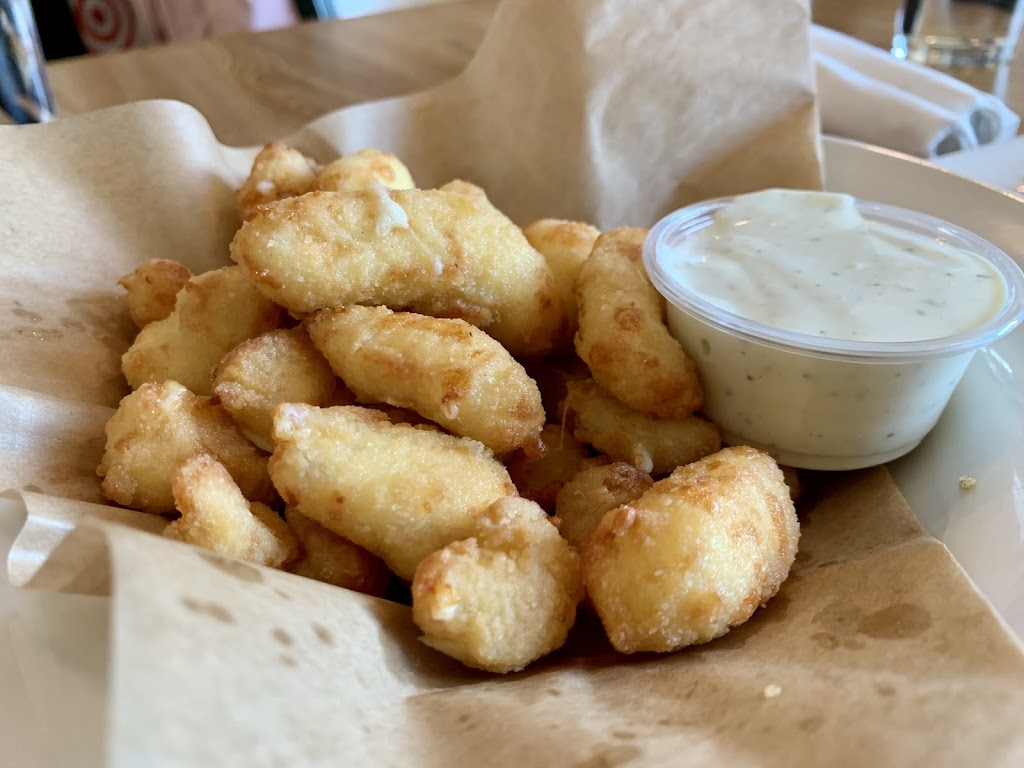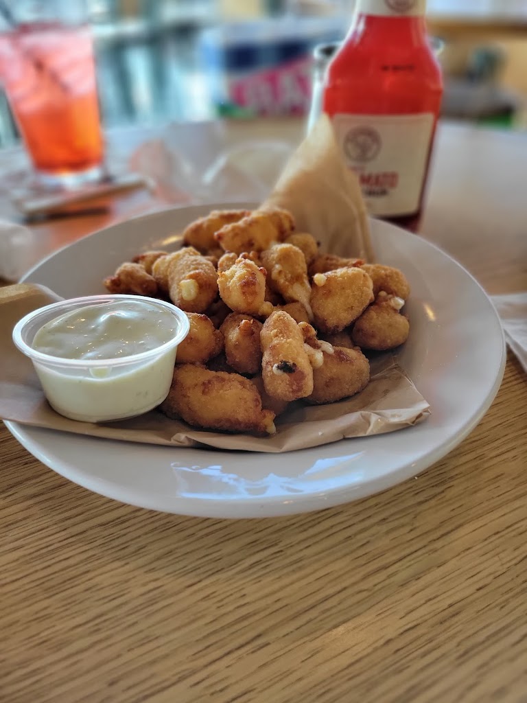 Good curds and fish tacos. Plenty of seating inside and on the patio. Attached to a mall, so parking lot is busy.
