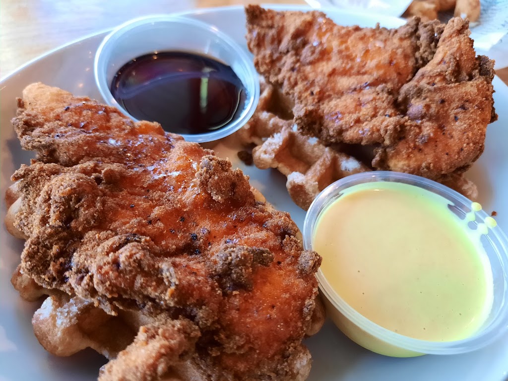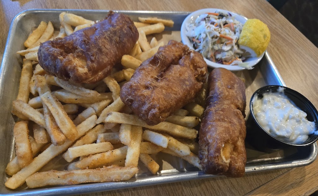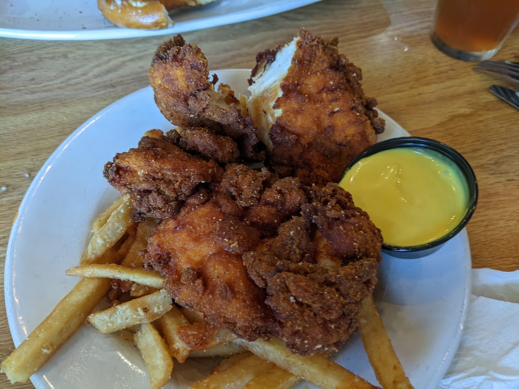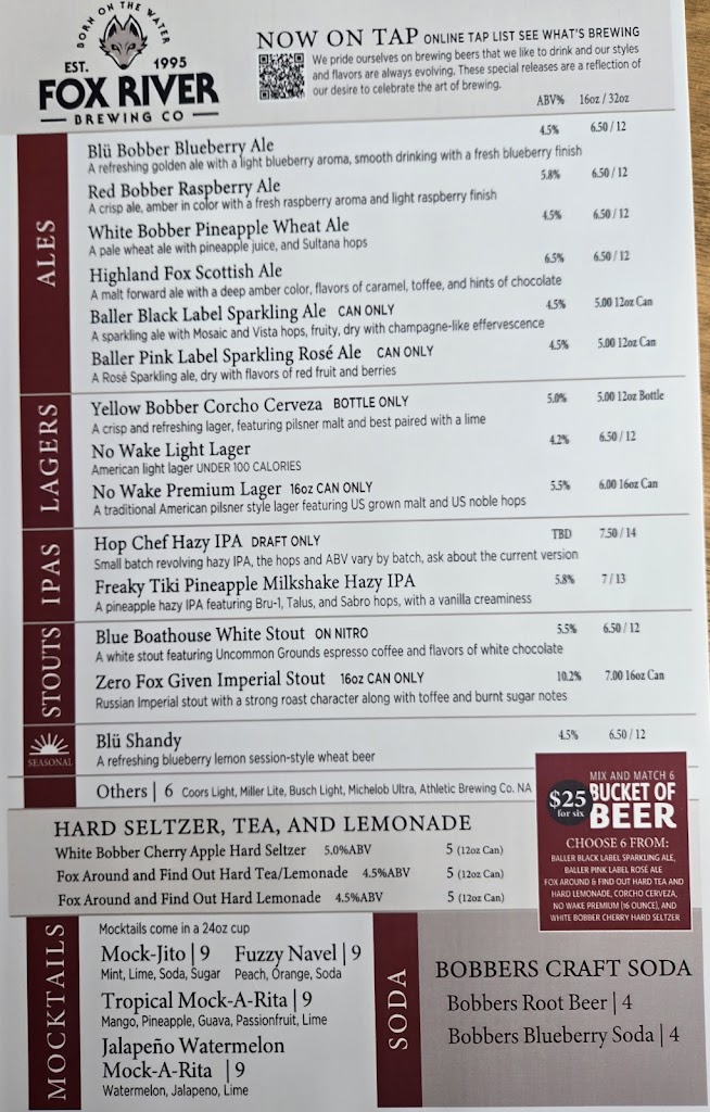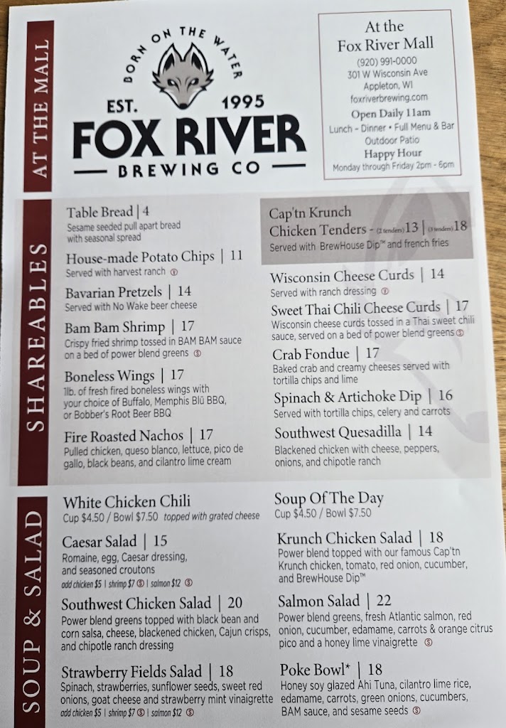 Fox River Brewing Company is a huge, self contained, restaurant which is adjacent to the Fox River Mall food court. It has a bar in one corner and an open kitchen in the other. In between, is a wide open dining area with many regular tables. The menu has a wide variety of choices, so I wondered about execution. Thus, I was pleasantly surprised by our piping hot dishes and their excellent textures. The flavors were spot on as well. I had chicken and waffles, and my cousin had fish and chips. We loved them both. The fish consisted of big, flaky, dark beer battered, cod fillets which held together nicely without being greasy. So, the fish and chips descriptor is accurate. The chicken was crispy and the breading was well seasoned. Either dish is a great choice. The staff was friendly and responsive. They brew their own beers and have a nice cocktail menu as well. I'm not much of a shopper, but this place might turn me into a mall rat. You know how you catch a rat, right? You put out good cheese! Of course, the curds there were good too. Nibble, nibble, zap!