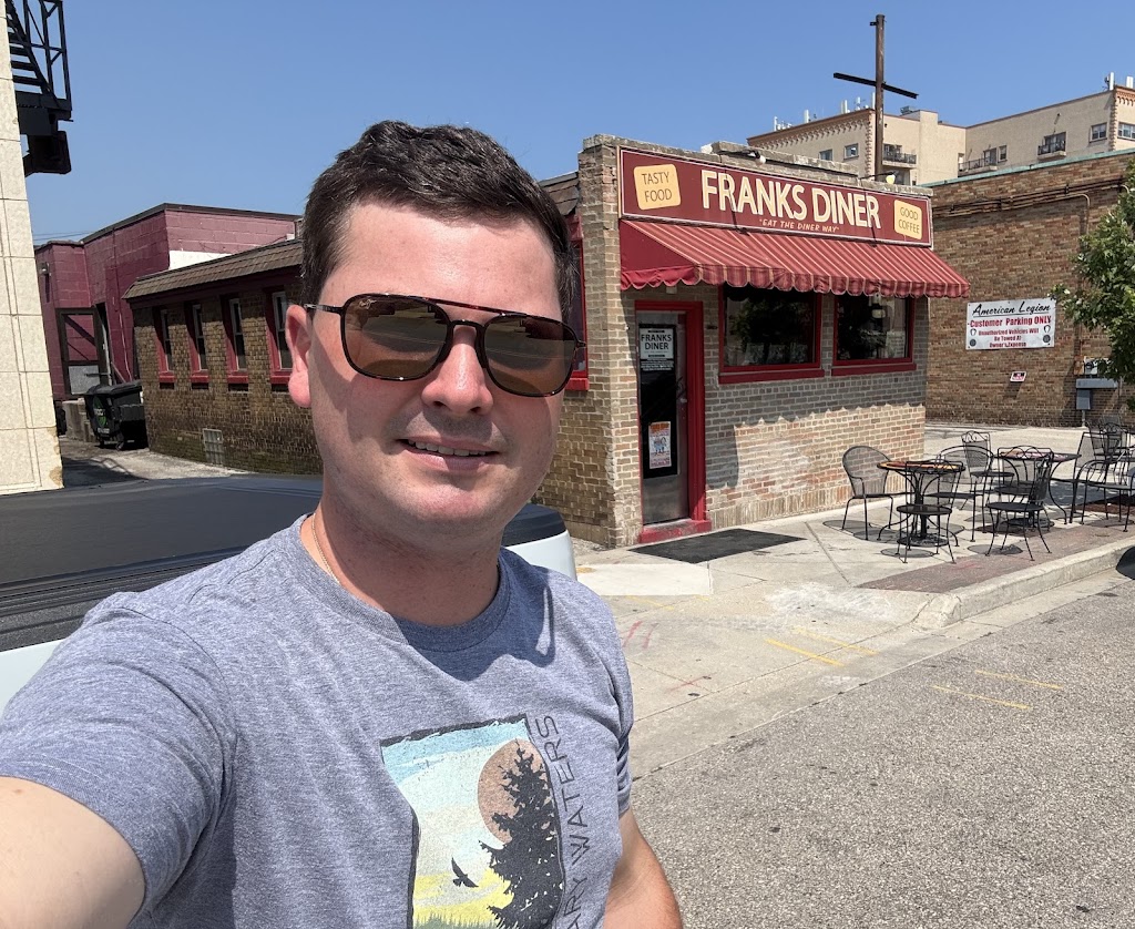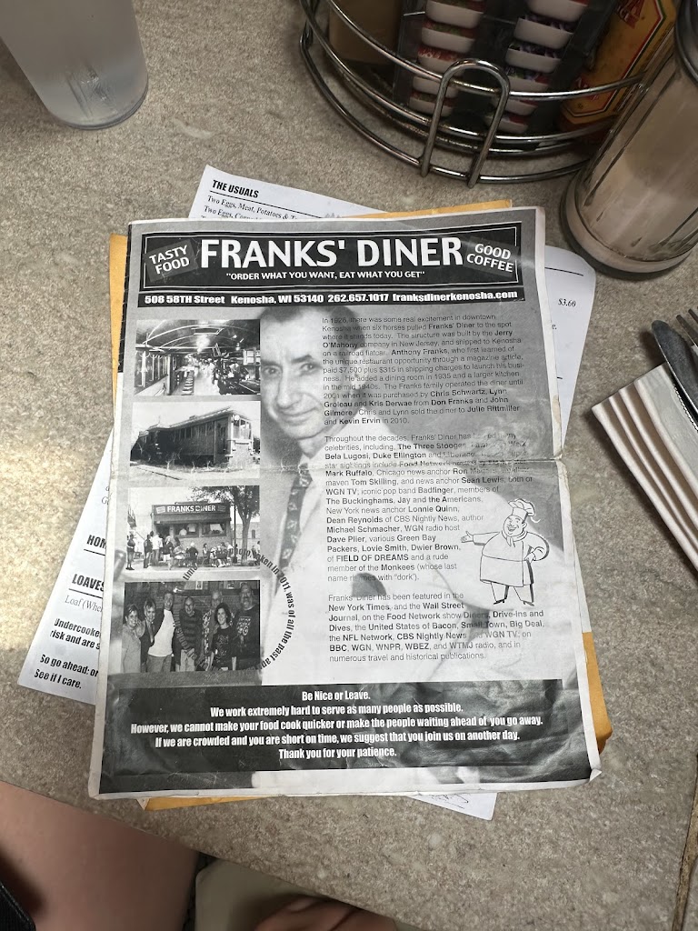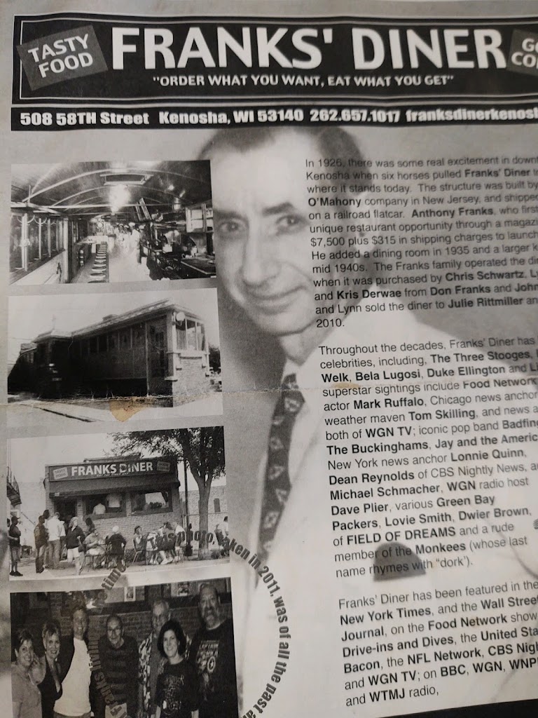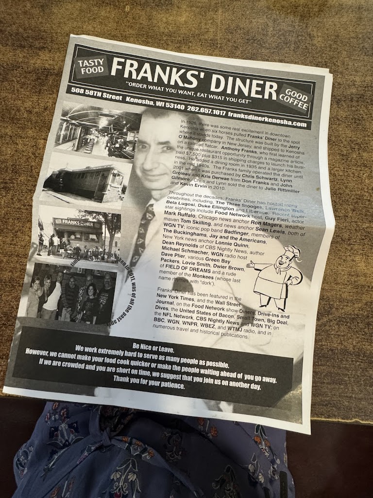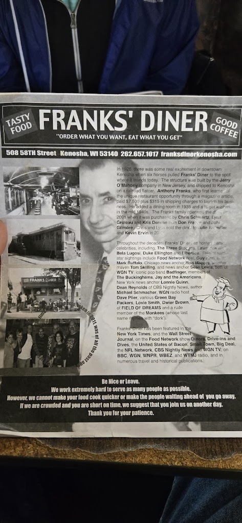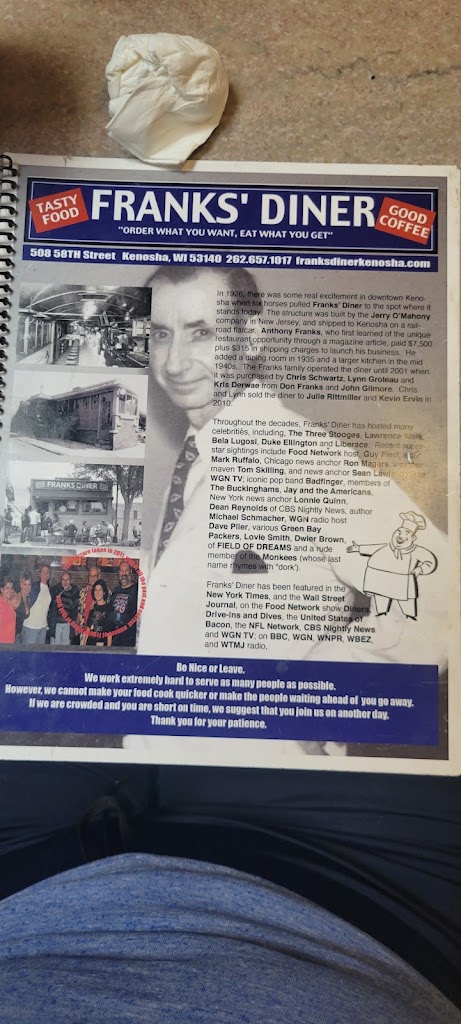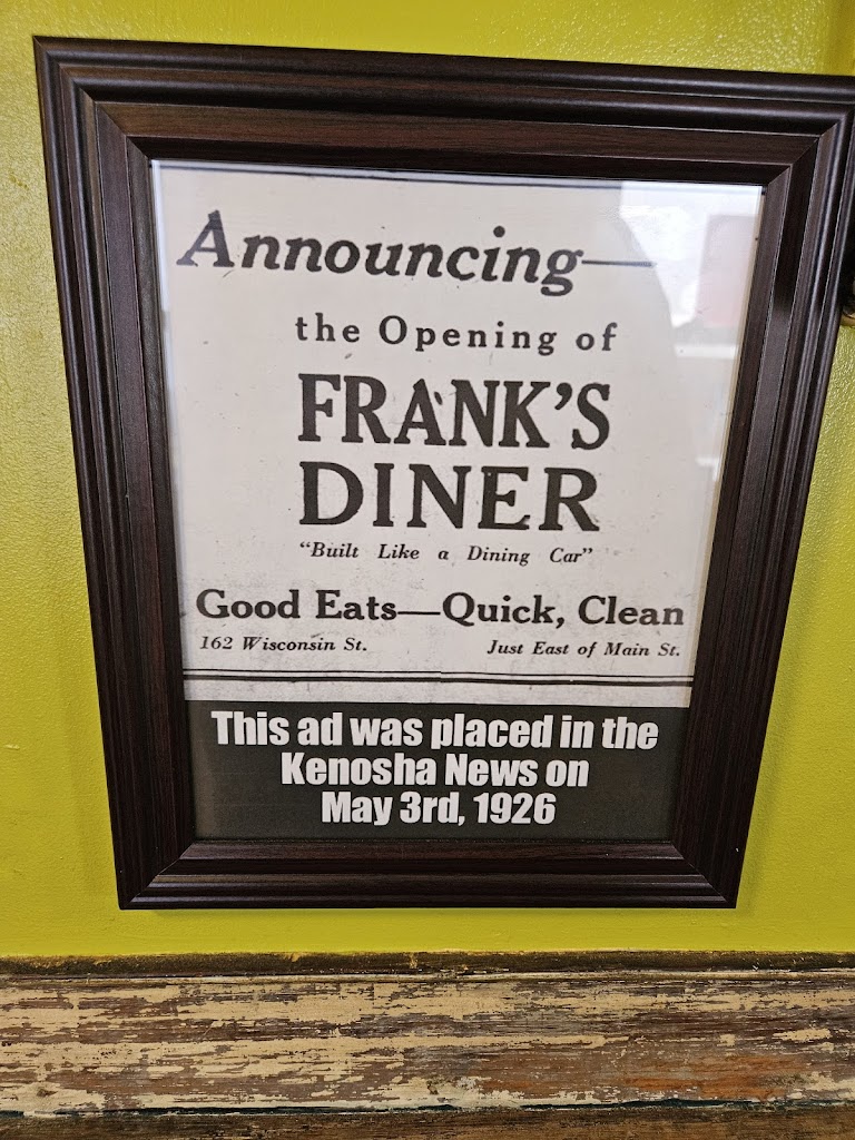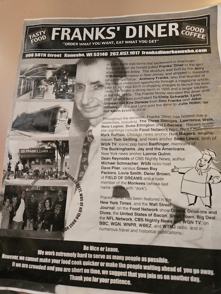 I have been in Kenosha Wisconsin for nine days and eight at Franks four times . This place is just awesome. Food, people, Service, and atmosphere is primo!! Go to Frank ‘s diner ❤️