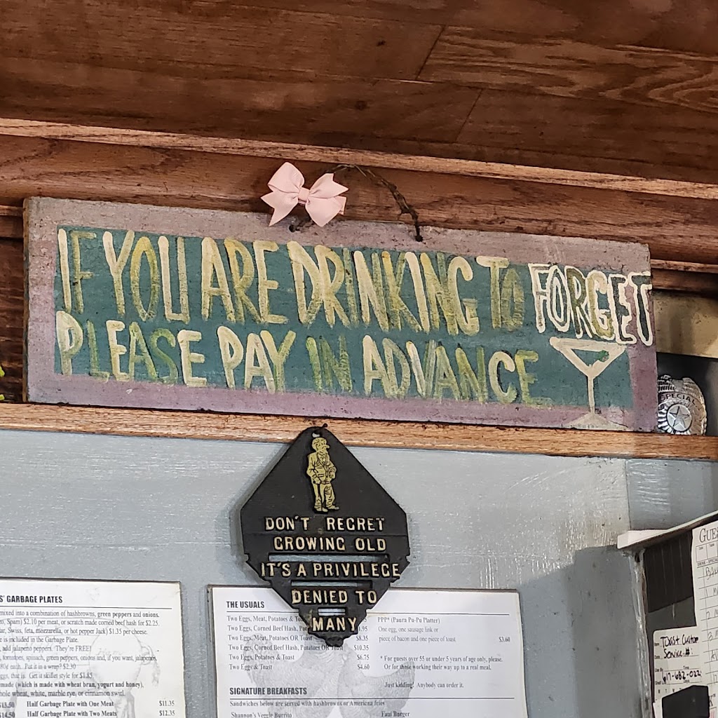 What an awesome experience! Crowded, fun, but cozy atmosphere. Tried the 1/2 garbage plate, the fresh bread was amazing, and the biscuits and gravy. DELISH! Great little bloody mary too! I heard they were 99 years old yesterday.