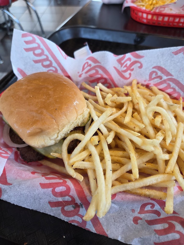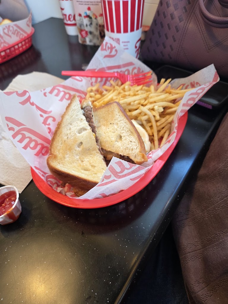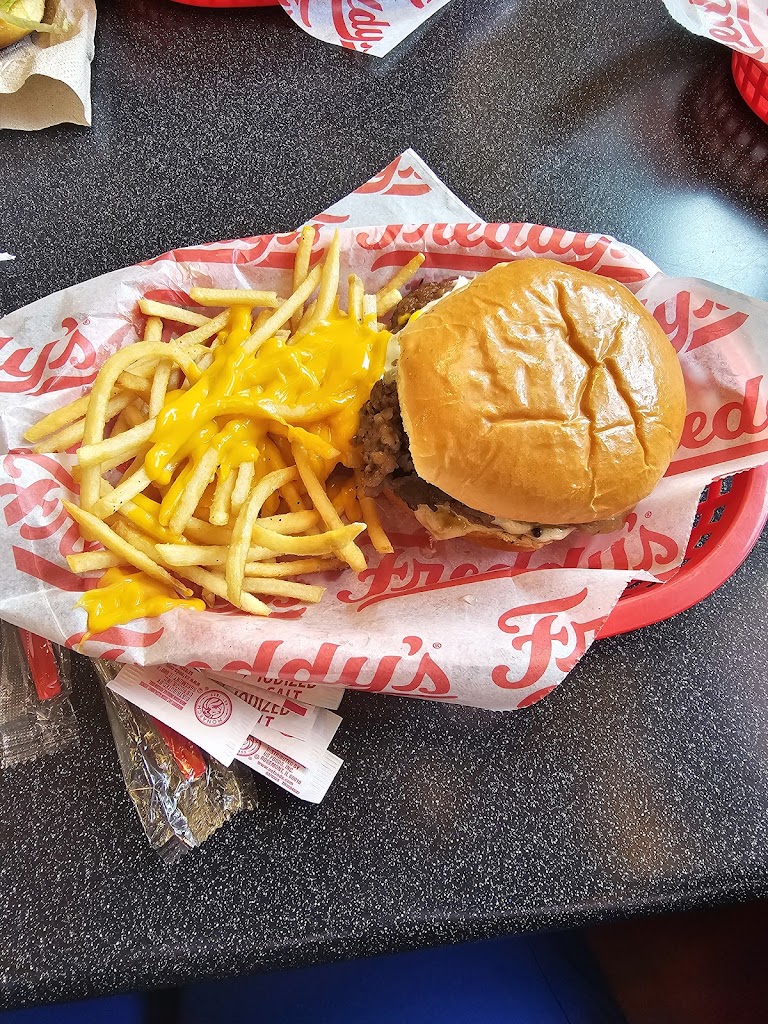 First time at Freddy’s and it won’t be the last! I had the California Style burger meal, and I loved that I could substitute it with an Oreo peppermint shake – which was amazing! The food was delicious, and the service was good. The only suggestion I have is to keep up on cleanliness; a quick sweep and a wipe-down of tables would make the experience even better. Looking forward to my next visit!