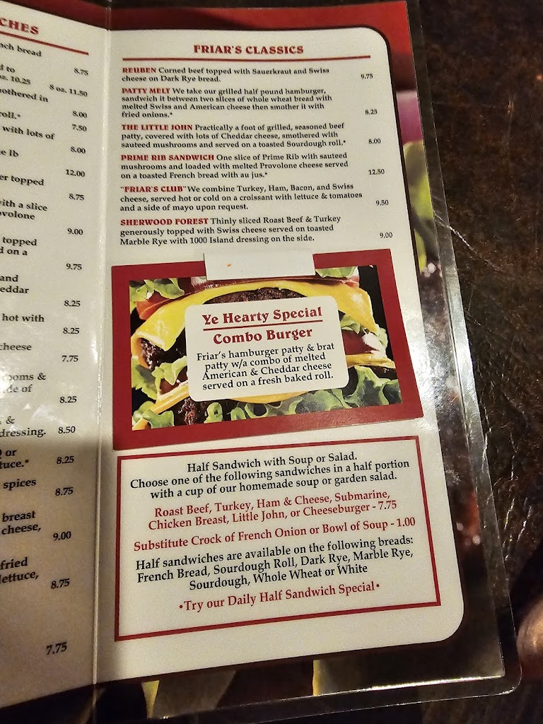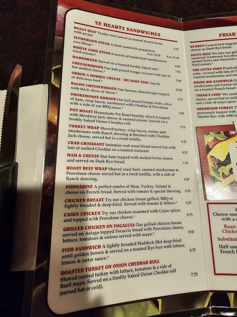 I had prime rib sandwiches numerous times over the years at Friars. I worked at a meat market for 18 1/2 years and know the difference between a rib I and prime rib. I had the WORST prime rib sandwich ever, they served me a rib I and they claimed this is what they call prime rib! Oh no, false advertisement and horrible substitute for what was supposed to be prime rib. NEVER again!!!!