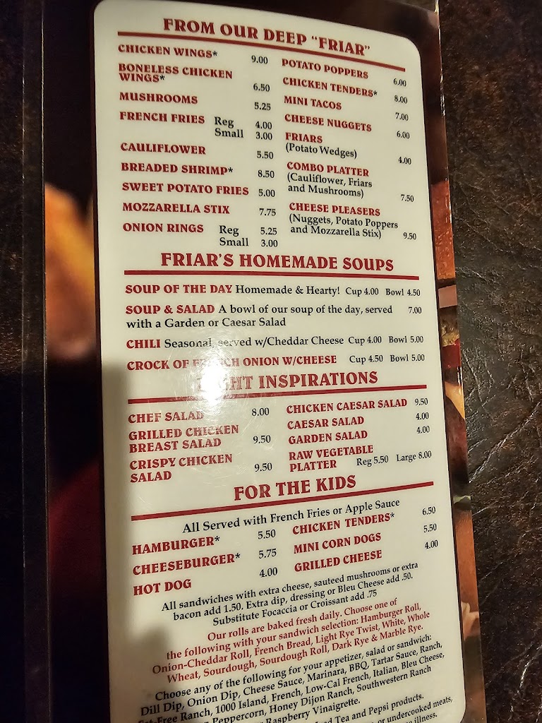 Very great place to go to for supper! But the only pretty impact on my review by 1 star is one time i went to friar tucks i ordered a half submarine and the soup was COLD. But i could under stand it because it was a busy day and it was a bit short staffed that day. so pretty reasonable. But still very good food!