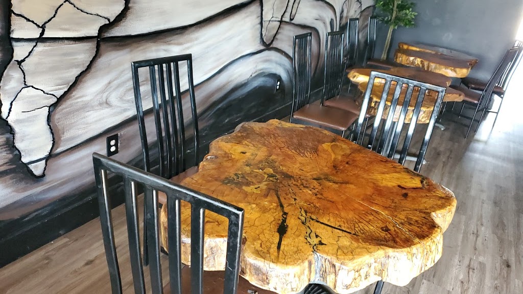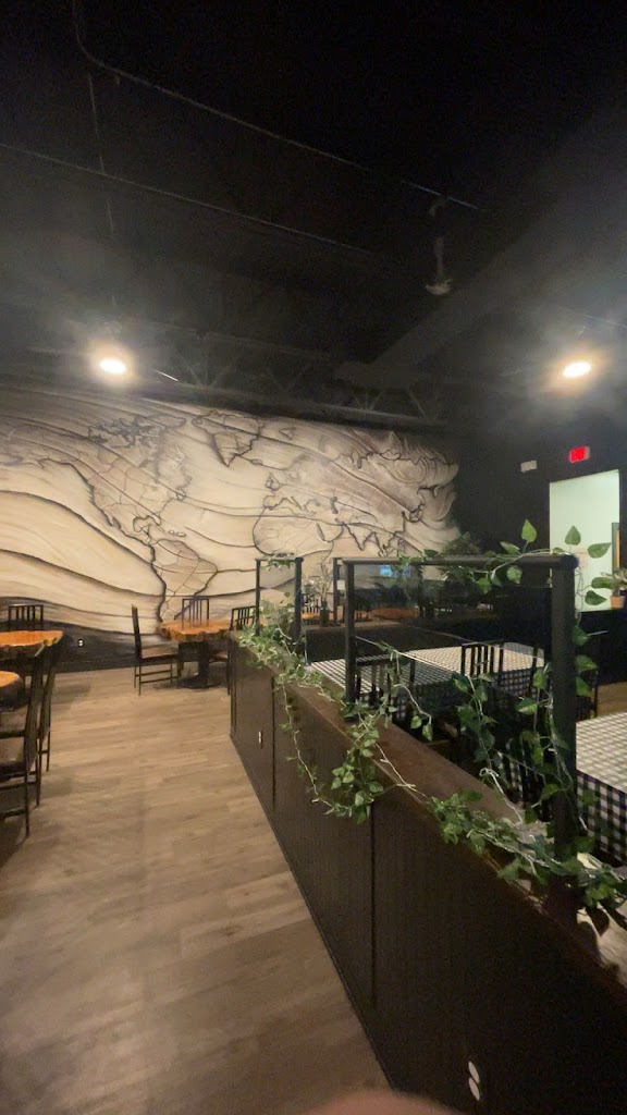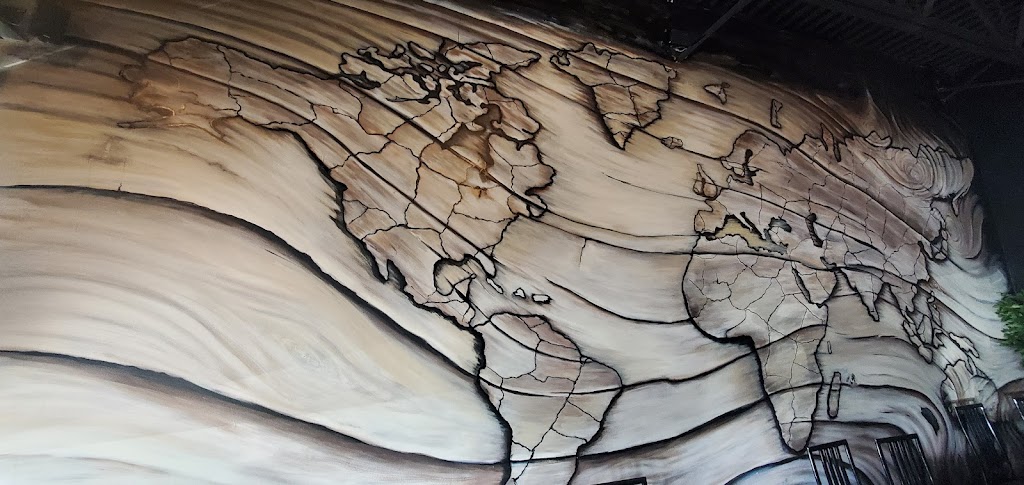 Very neat inside. The wall is an incredible painting of the world map, tables are super neat epoxy tree sections.