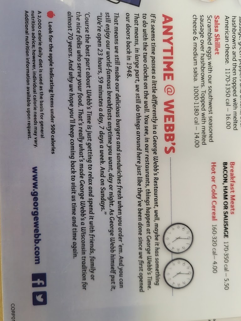 Cheap diner food, George Webb is to Wisconsin as Waffle house is to GA. Great place, I love going there, late night Fridays and Saturdays always seem to bring an interesting crowd