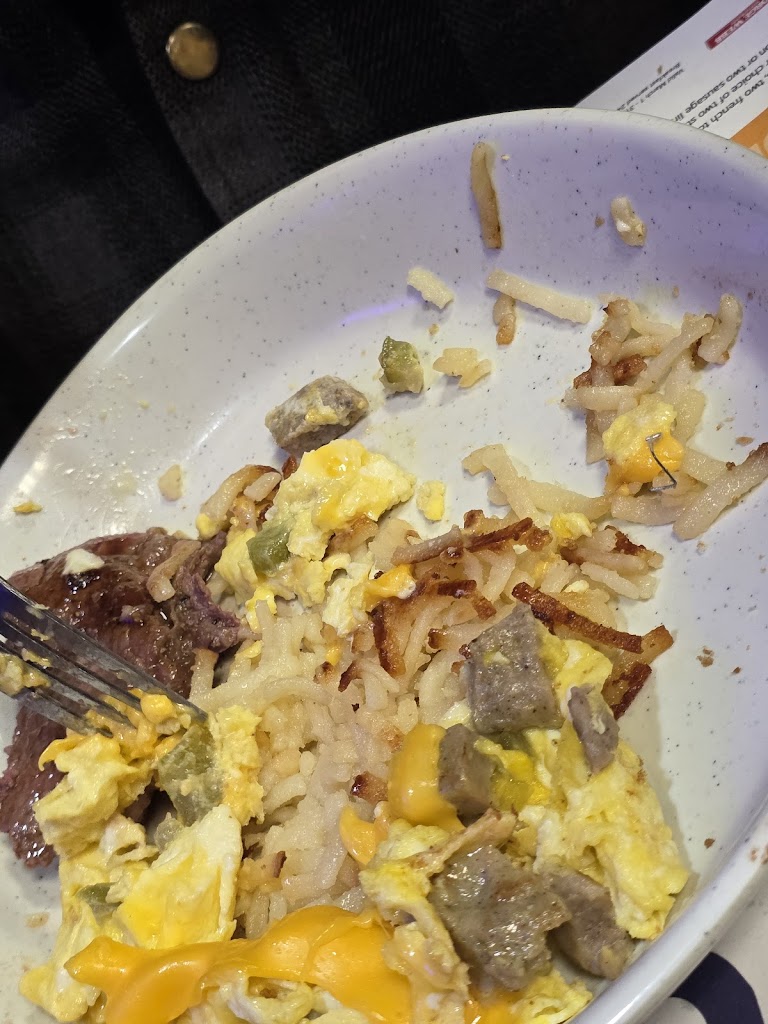 To say that I am disappointed is a bit of an understatement. What I expected to be a quick and simple pickup started off unpleasing the second I walked in the door. There was only one person manning the entire establishment which at my time of arrival had 5 other eat in diners of which not a single one of them had food in front of, let alone a typical glass of water. The cook greeted me promptly and asked me to wait a second before he could ring up my to go order. He started putting food on the grill and then came and rang me up. He then handed me my to go box of food without a bag and confused, i grabbed the box from him. (cutting him some slack because he is the only one there, I didnt say anything) I paid and exited the restaurant with my food. I got home about 10 minutes later, expecting my food was going to be a little cold considering it was only 27 degrees outside and lacked the extra insulation that the bag would have provided. Still, no big deal... The major issue that upset me was that as I sat down to eat my food, made the observation that my sausage scrambler appeared to be completely unseasoned. Ok...I can add my own salt and pepper...BUT THEN as i went to take a bite noticed that my scrambled eggs were still runny, cheese was BARELY melted and hashbrowns mushy...trying to eat this was comparable to that of something that was served straight from a blender. so not only is my food cold and unseasoned, ITS MUUUUSHHHH. I paid almost $16 for this meal as well as gave a $2 tip for an extremely unprofessional order handoff and food that was so mushy it might as well of been blended.