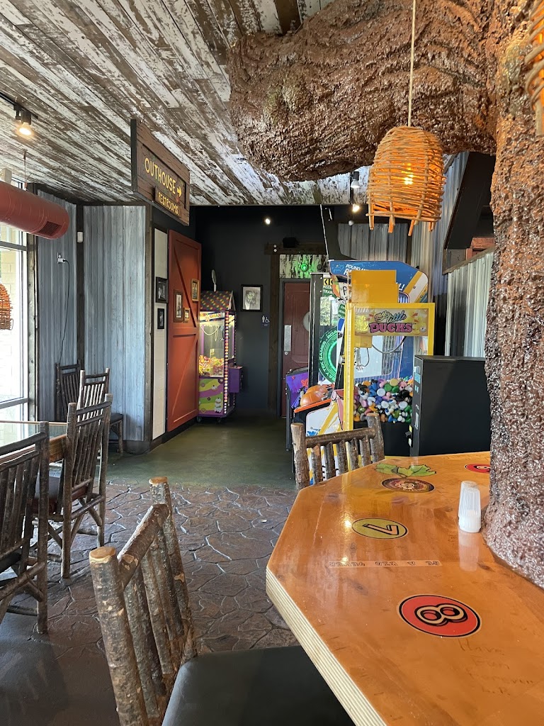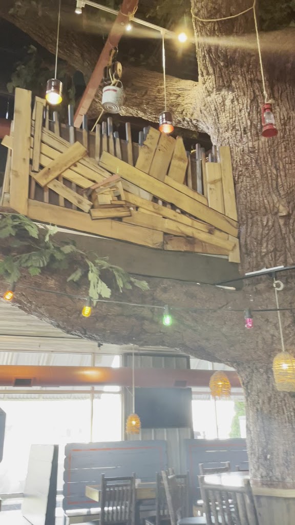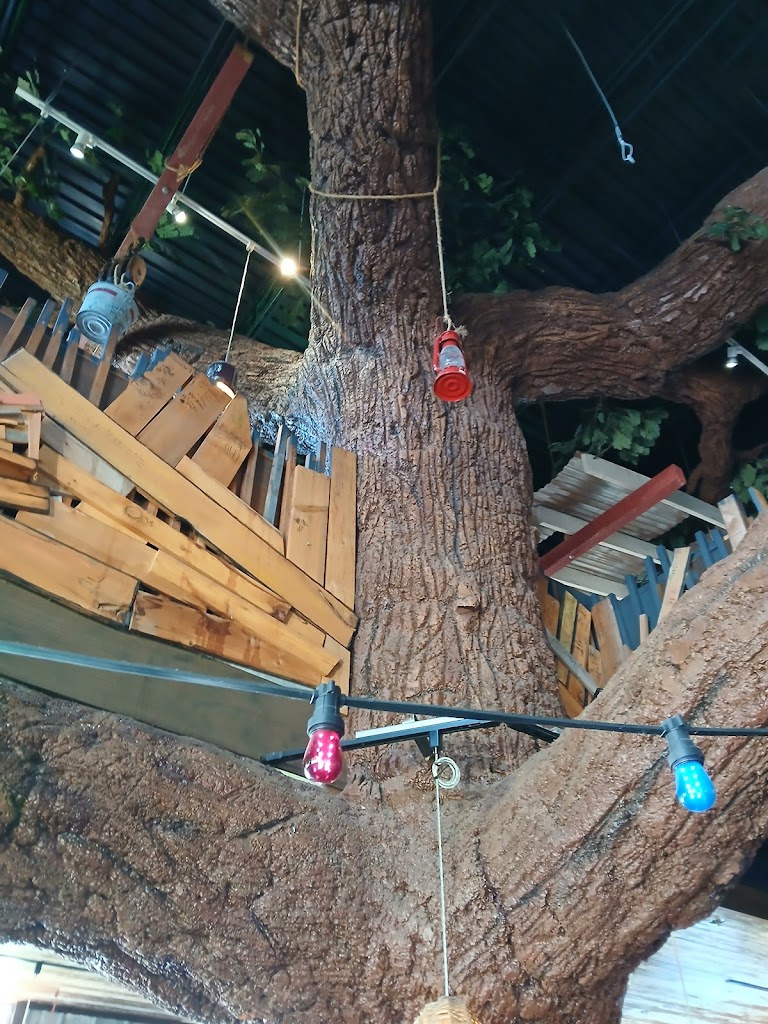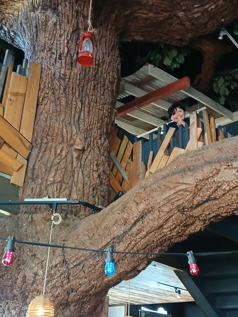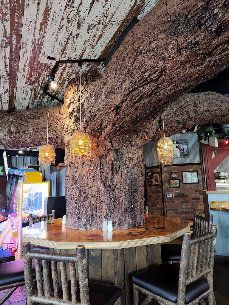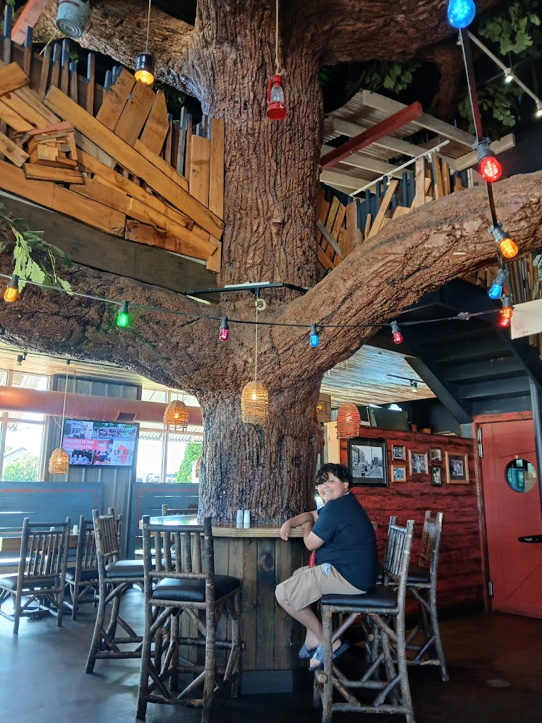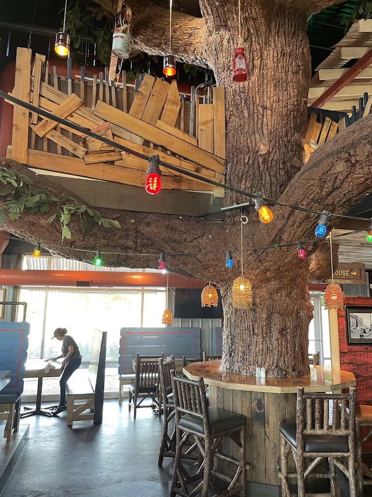 We stumbled upon this restaurant while visiting from Illinois today. I was shocked at how well our cashier entered our order. We didn’t know what we were ordering, the kids were mumbling through options with their sandwiches and shakes, yet everything came out correct! The inside atmosphere was cool. There was some damage done by previous customers like names scratched into our table and the tree trunk having some gunk on it, but that’s the fault of the customers. We wanted to sit upstairs in the tree, but it was full. I love the idea of the theme and the food was perfect for our family. I just wish it was bigger. Highly recommend!