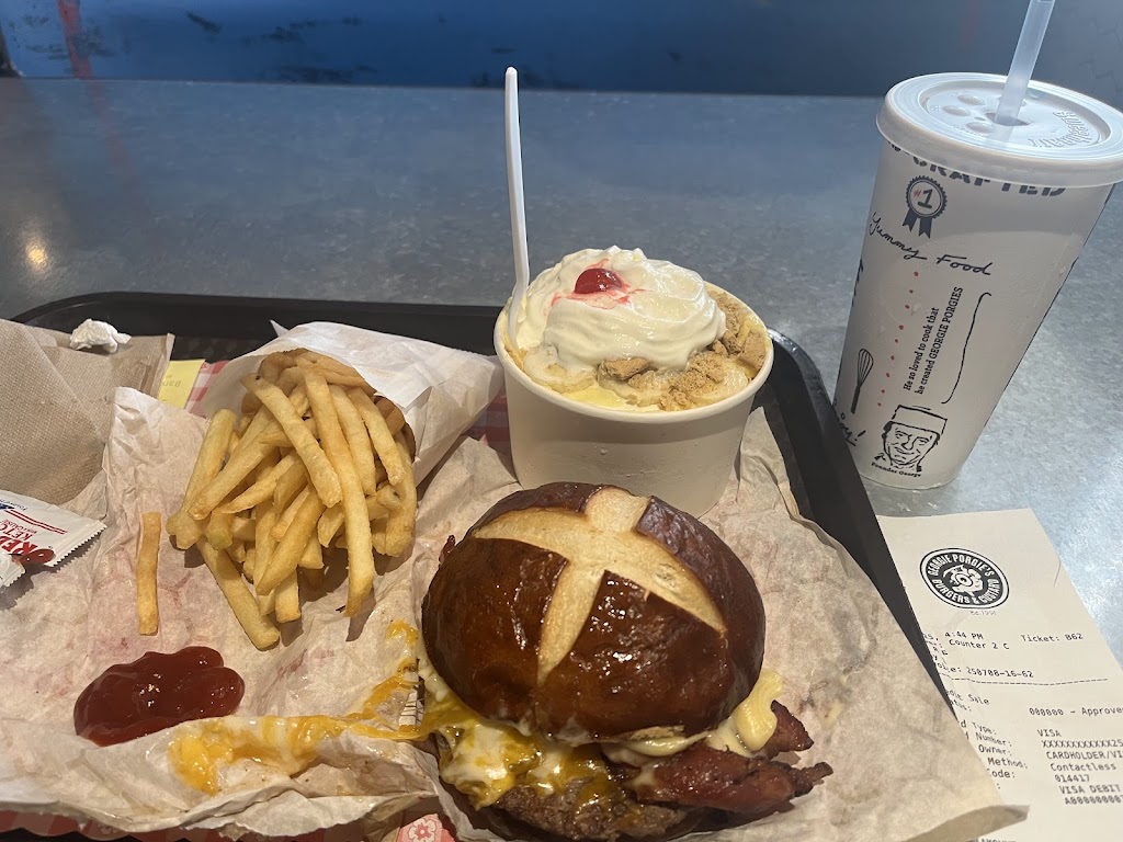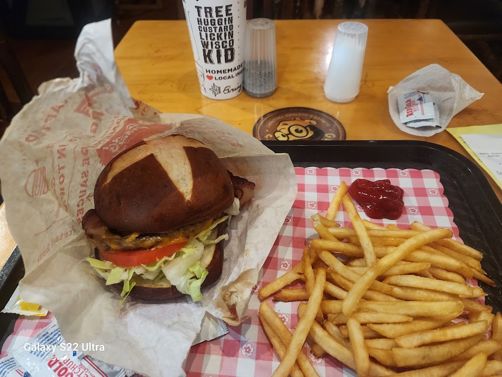 Beer cheese bacon pretzel burger and cheese curds were great, locally made soda was is decent.