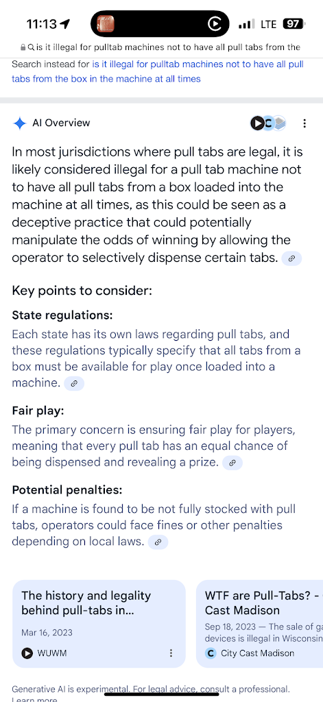 Pull tabs at this location are a scam!!! We asked if all winners were reflected on the sign. The bartender said yes. We bought out a box that had $5000 left of winners. Scratching all tabs, we won just over $250. We went to the bartender and inquired why we had only won $250 when over $5000 was shown still on the sign. The first bartender told us that it was because they didn’t have all the pulltabs out in the machine. The second bartender said it was because sometimes adults give the tabs to kids and winners get lost. Are you serious?!?! While gambling comes with risk, the owners shouldn’t swindle people like this and this seems incredibly dishonest and illegal!!!! We will be reporting this fraud so others don’t get scammed!!!