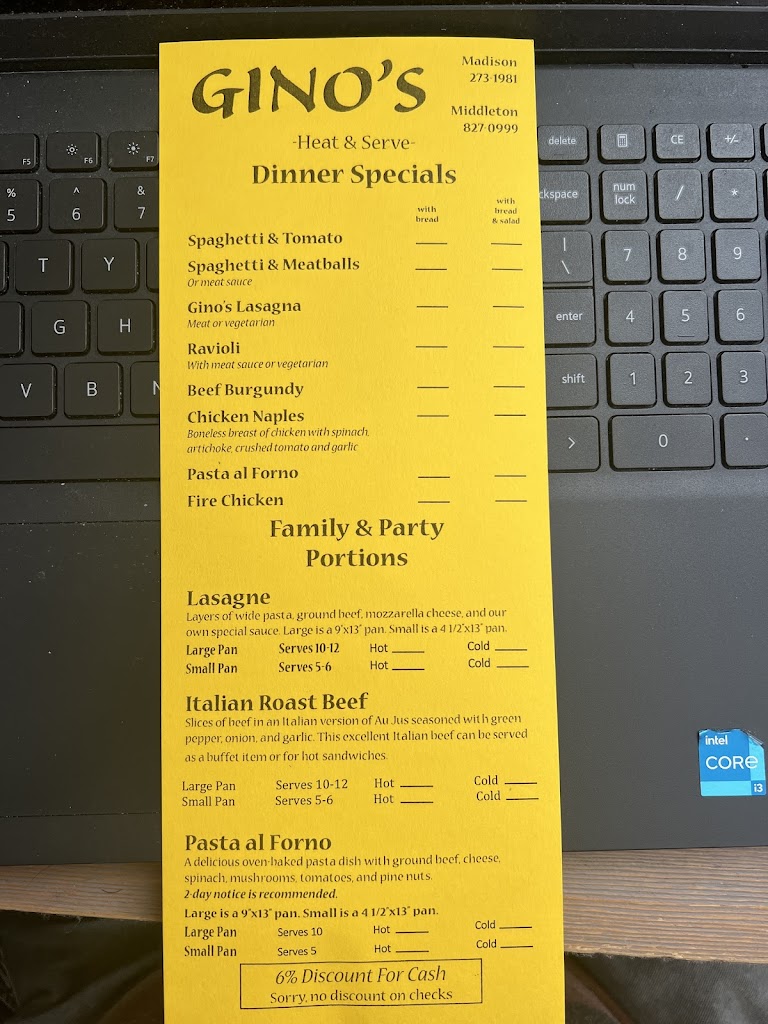 Gino's is the best Italian deli in Madison! They have a good assortment of sandwiches made with top-notch ingredients, I love their spicy capicola, it has quite a kick to it. The large size sandwich is a little over $7.50, and well worth it.