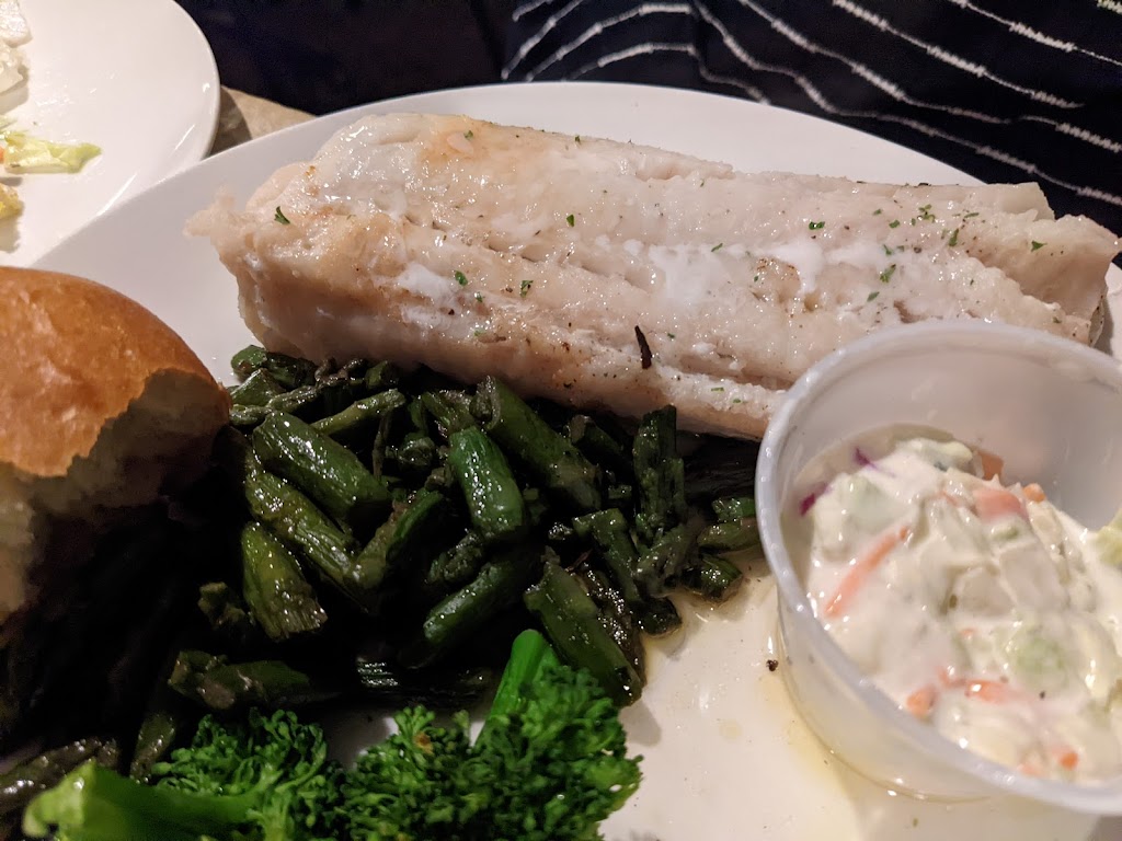 The fried haddock (lg portion) was four pieces and served with choice of potato. The batter was crispy and thin, but the fish overall lacked flavor. The potato that was ordered was hashbrowns which were like the ones you get from McDonald’s (which isn’t a bad thing at all).