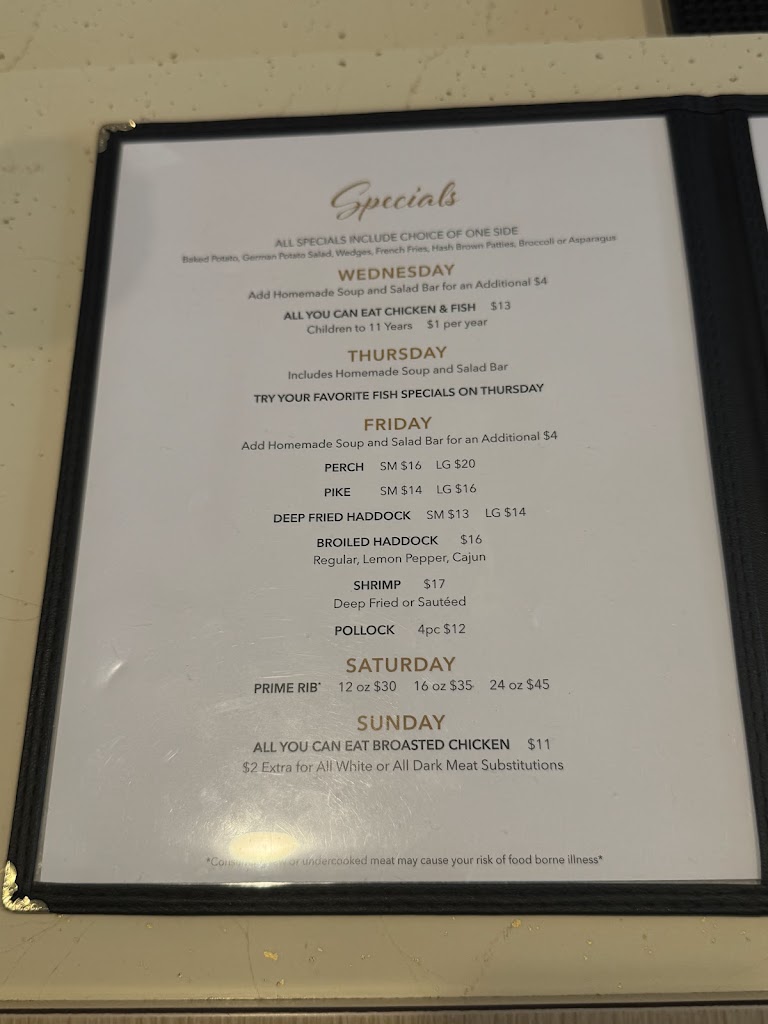 They have one of the best prime Rib Saturday you will find in the area and I literally love the Sunday night bartender! I’ve never been disappointed in anything I’ve ever had. Great small old school supper club in Wisconsin.