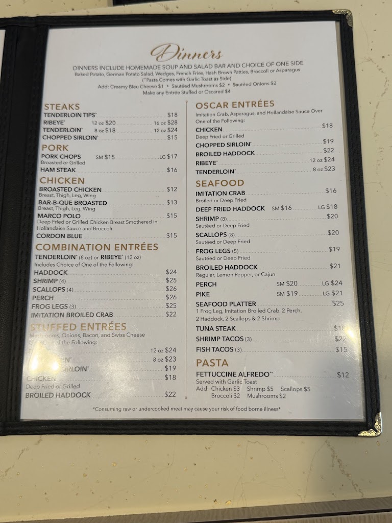 The food was exceptional... Tenderloin was fork tender, shrimp and scallops we're cooked to perfection. Salad bar was small, but adequate. Service friendly and very quick with entrees. Will definitely be going again.