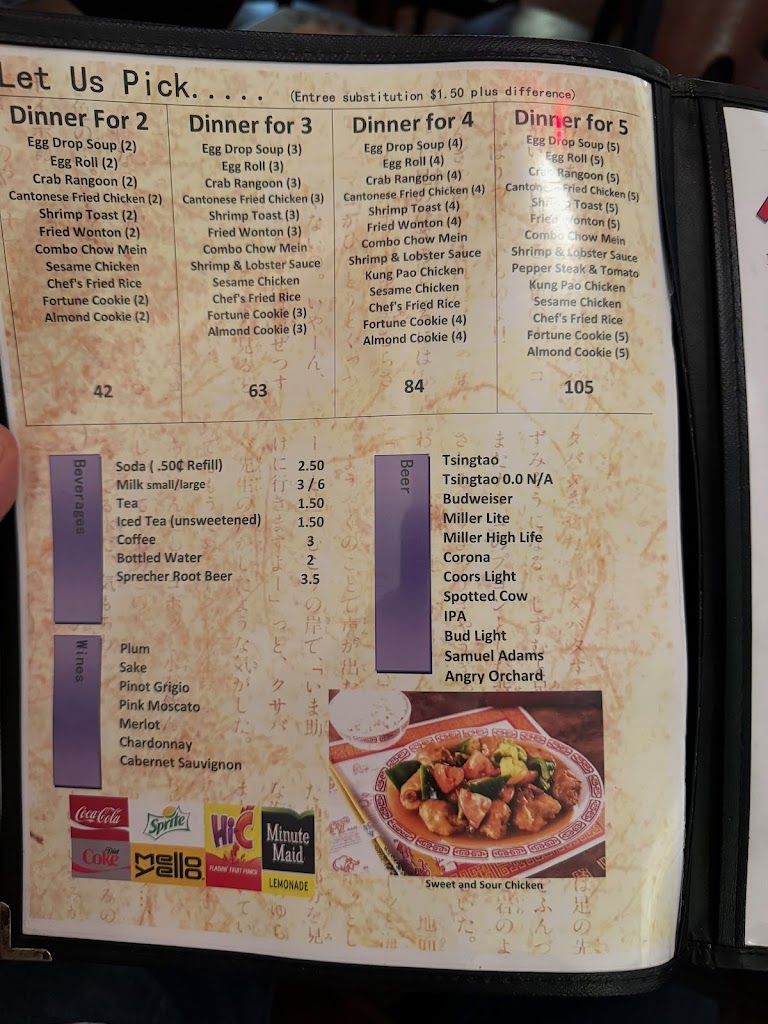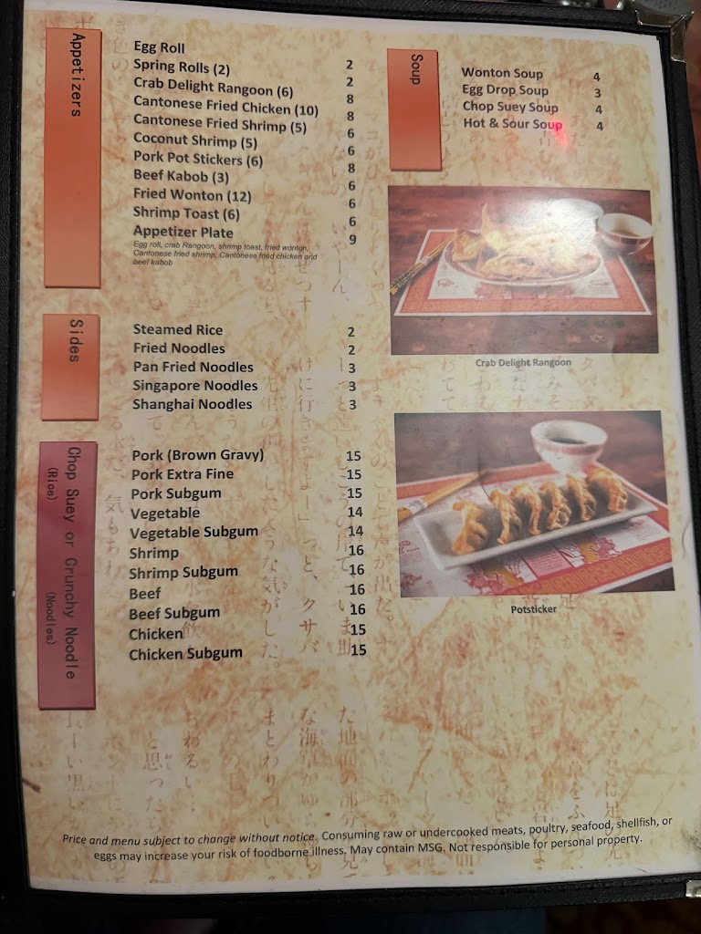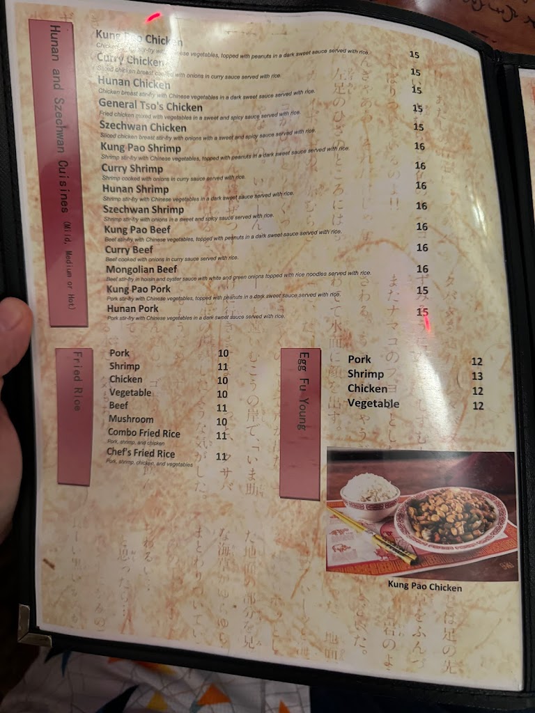 This was my second time eating here in the last 6 months. My first time I thought the food was decent but it seems that you just can’t find really good Chinese food anywhere these days. My friend and I came for lunch and ordered off the menu. My chicken eggfoo young was dark brown and completely dried out could not find any chicken in my patties. The gravy completely tasteless. My friend had sweet and sour chicken and she said it had very little flavor. The chicken was fried in very thick batter that she said was doughy. We had crab rangoon and did enjoy it but I didn’t take my leftovers home and she did. We decided not to eat here again. We keep searching for good Chinese but don’t think it exists anymore like it did years ago.