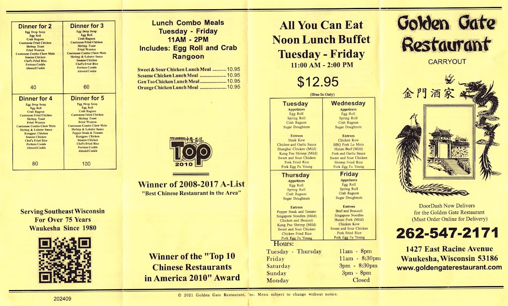 Got a sizeable dinner for my family who I visited in Oconomowoc. Oconomowoc does have a Chinese place but it doesn't hold a handle to Golden Gate!