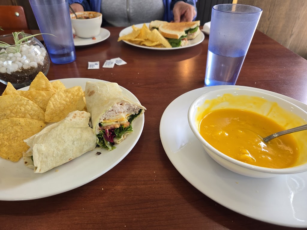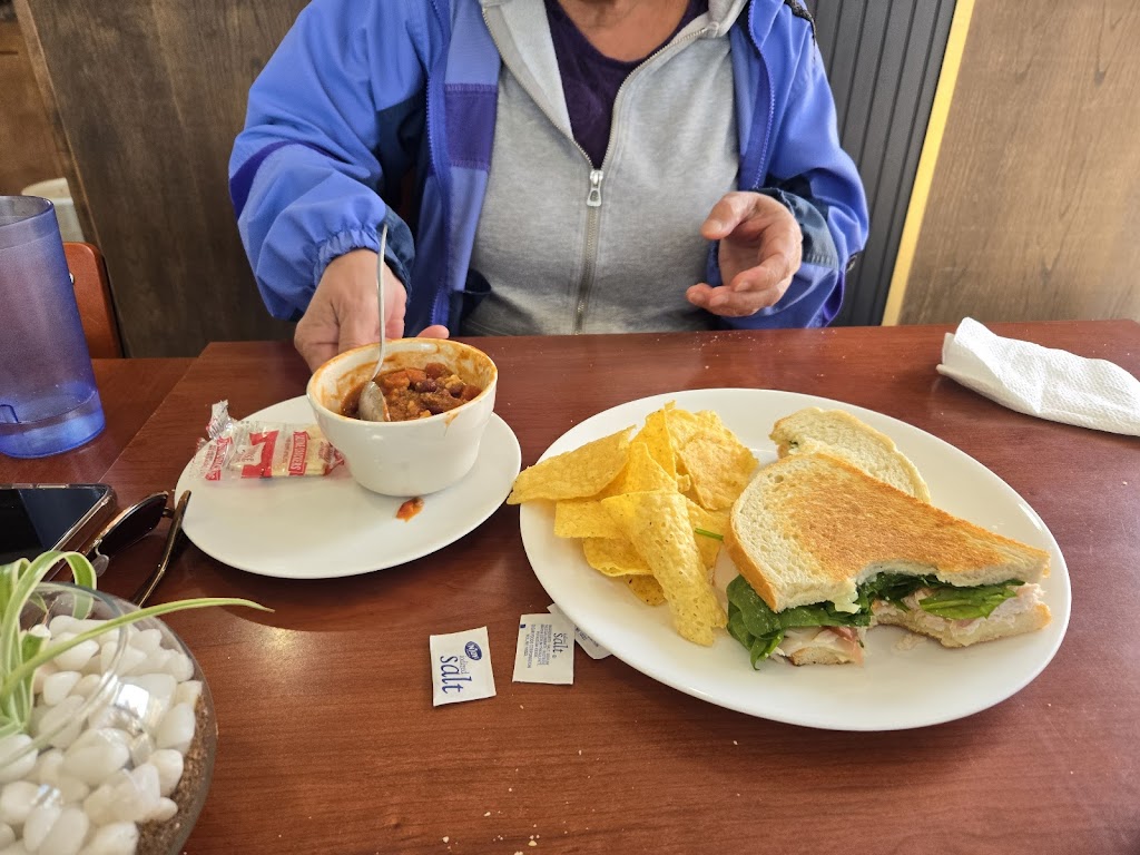 Service was horrible. I bring my Mom in a wheelchair get her arranged at a table. They ask are you getting your order to go? Really? Bring paper to go cups when we’re dining in. No thought to what might be needed at the table for my Mom’s tea! No service really. Our chili was like warm. The sandwich I had was 1 thin slice of turkey and absolutely terrible. Won’t be back here.