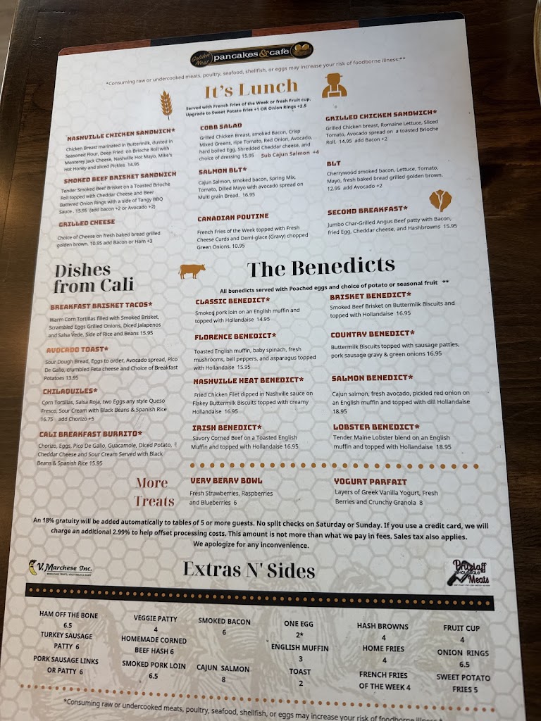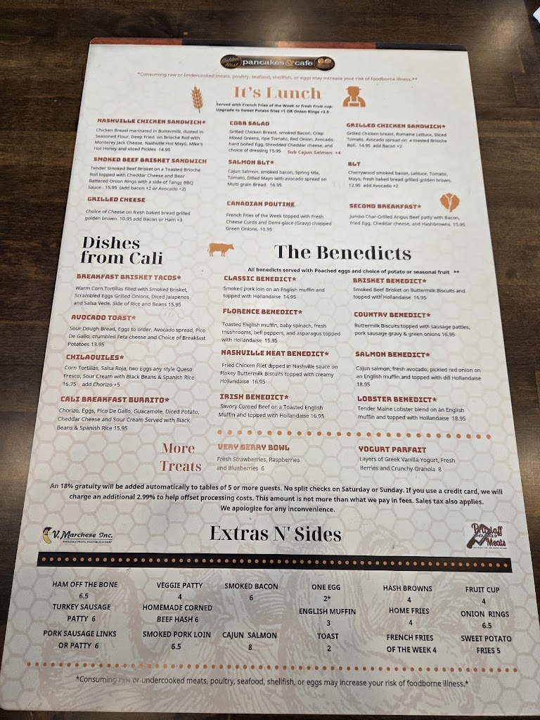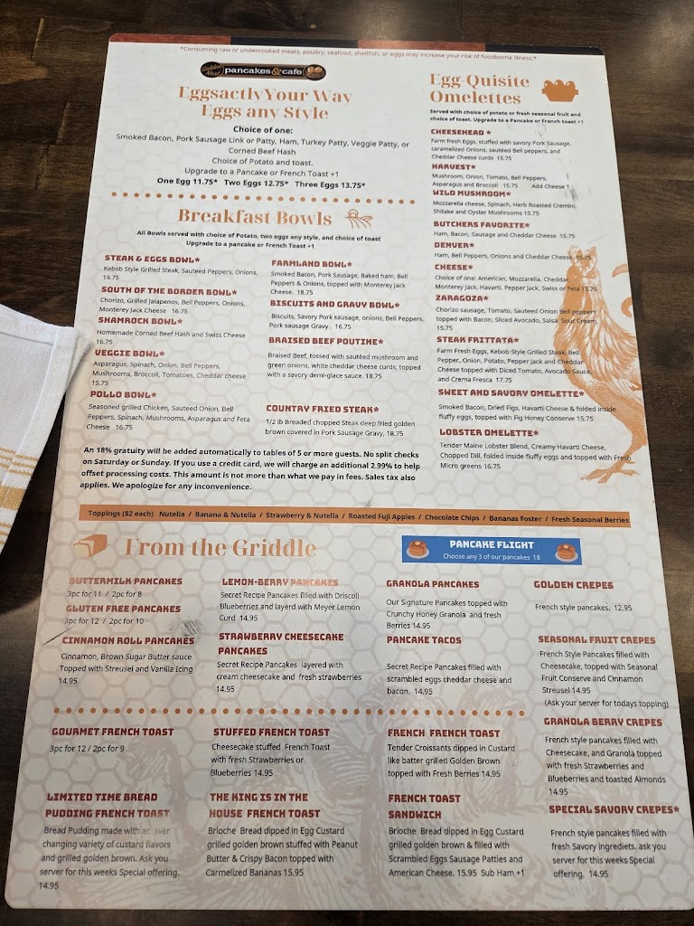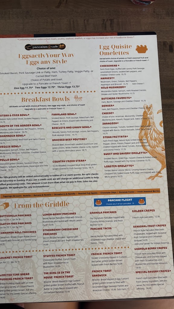 You must have the pancakes, substitute them for toast if you have the option, or try one of the many cake-only meals. When subbing for toast they're the perfect size. Pancakes are on the name of the building and they're done perfectly with some fun add-ons. I recommend the chocolate chips as they add some flavor without taking away from the cakes themselves and you can skip overdoing the syrup (which is very watery just the way it should be).